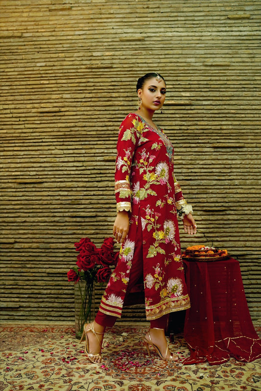 Scarlet Enchantment: 02 PC Maroon hand embroidered Chiffon suit - CE4860823