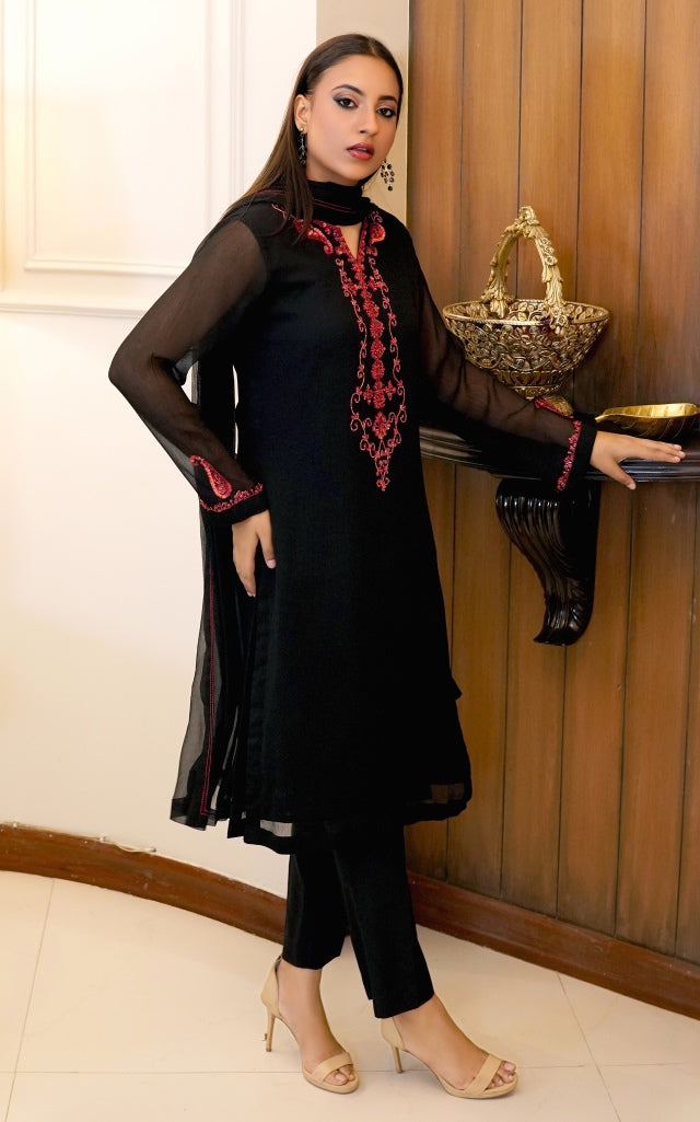 This chiffon suit features a rich, rust-colored embroidered design on a sleek black chiffon fabric. It is a sophisticated and stylish addition to any wardrobe.