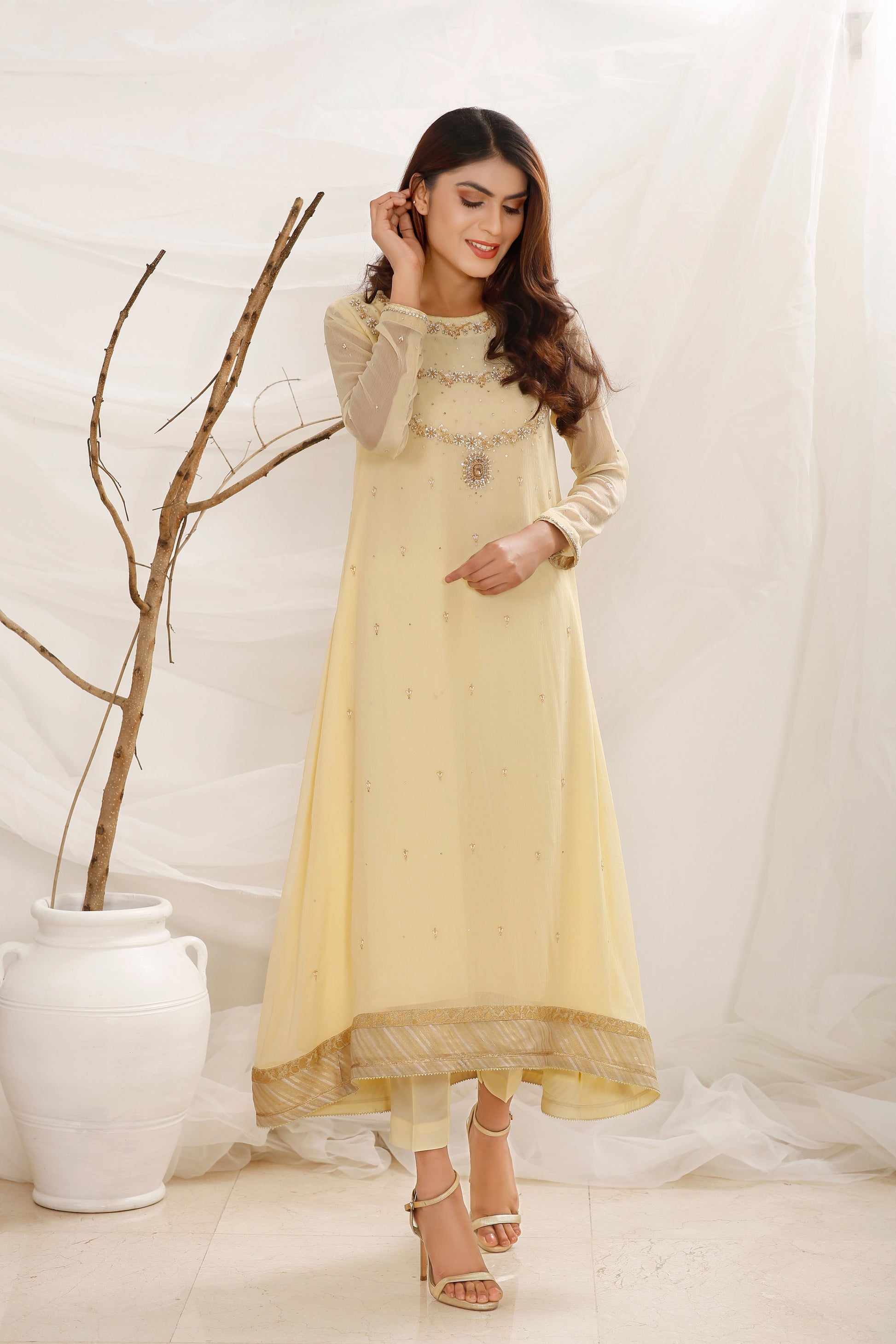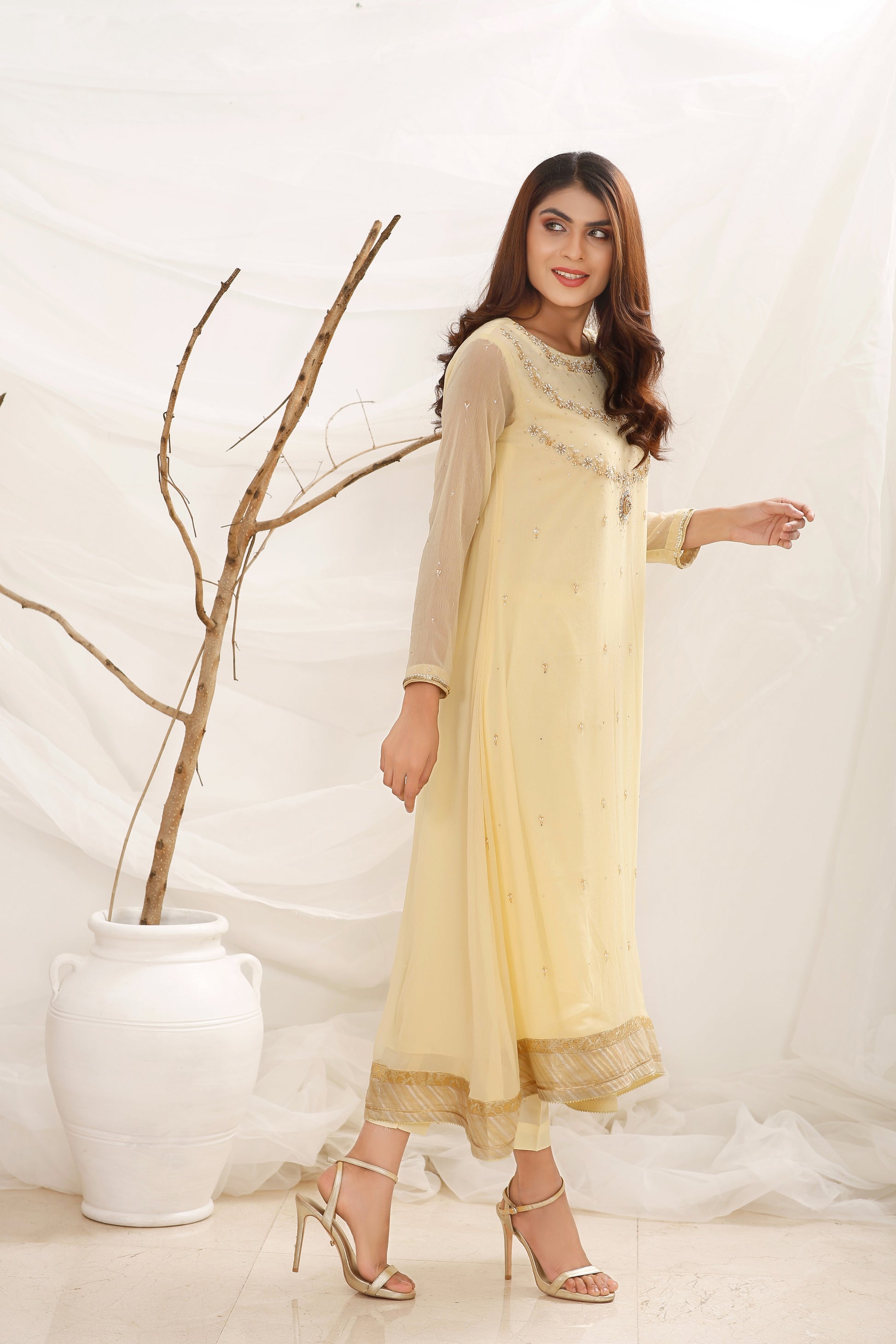 This pale yellow 2-piece set features a stunning combination of a chiffon long shirt and crepe trousers. The golden work on the yellow shirt adds a touch of elegance and sophistication. Perfect for formal events or special occasions, this outfit will make you stand out with its chic design.