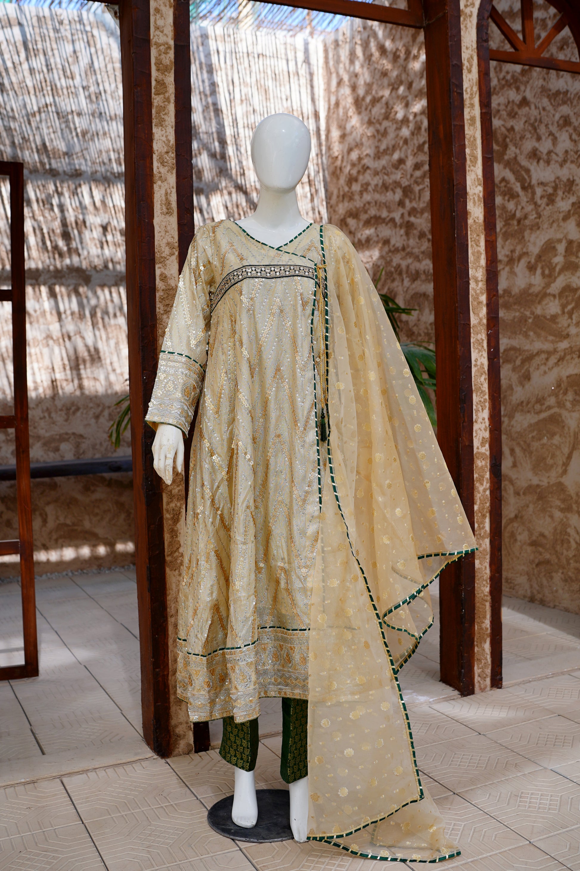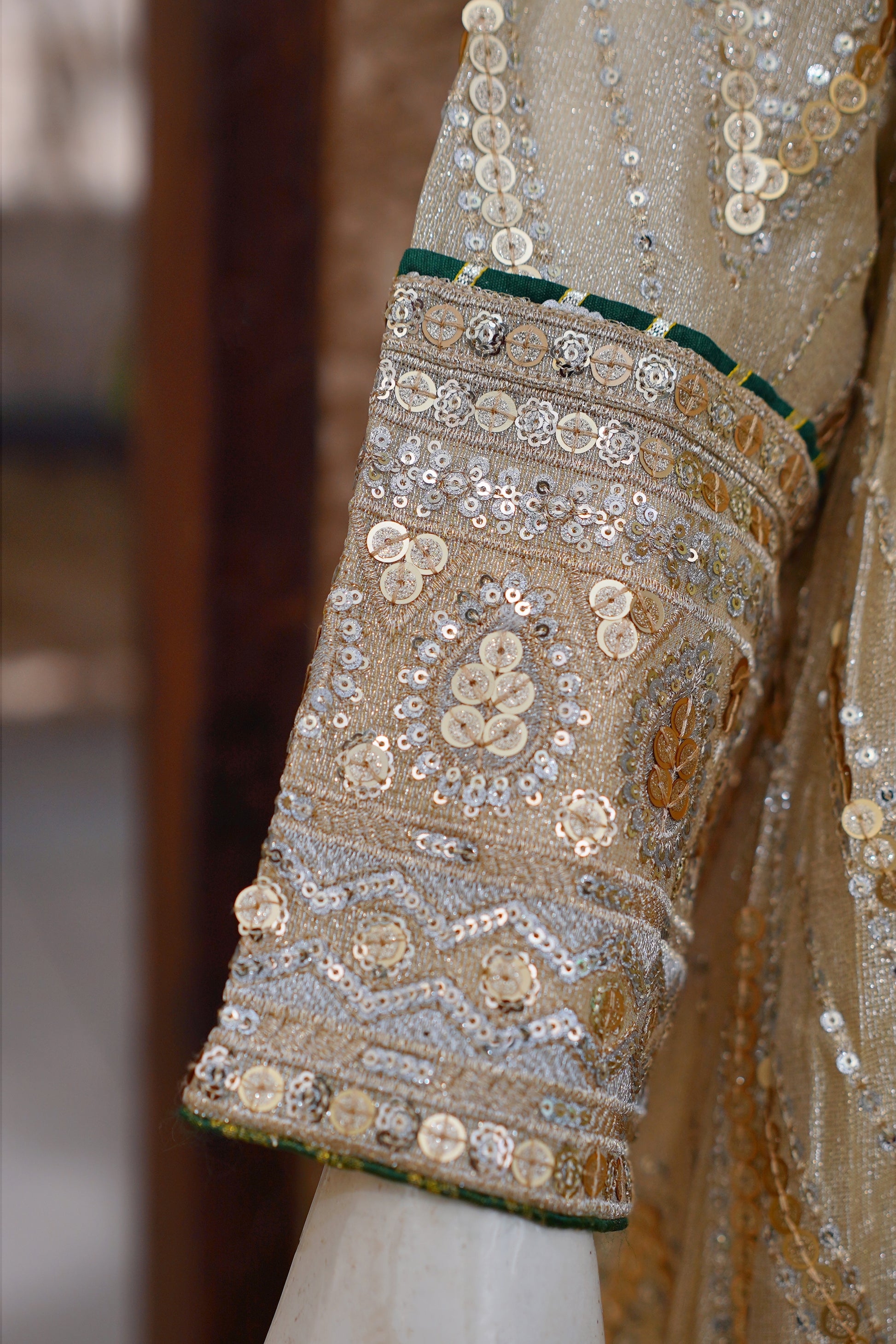 This stunning gold Angarkha is your ultimate festive outfit to flaunt, no wedding invitation required. The sequined top, adorned with a beautiful array of motifs and a splash of vibrant colors, ensures you’ll stand out at any event. Paired with green Banarsi pants and a gold organza dupatta, this outfit will make you the center of attention.