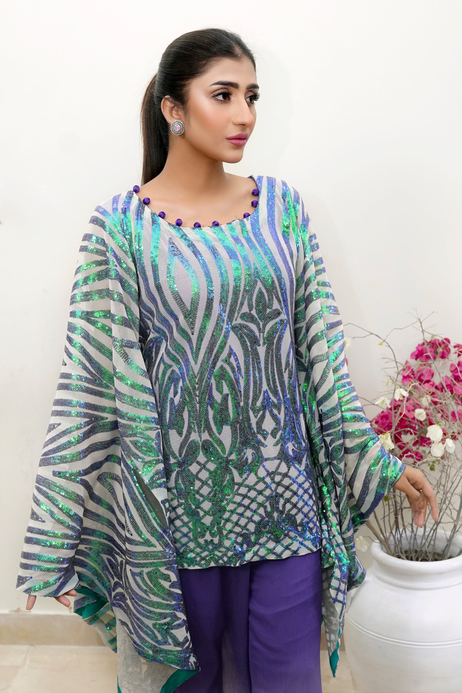 Happy times call for a happy outfit! Featuring a vibrant mix of colours, this ensemble needs no second thoughts. The dramatic cut adds a bold touch, while the panelled trousers enhance your feminine side effortlessly.