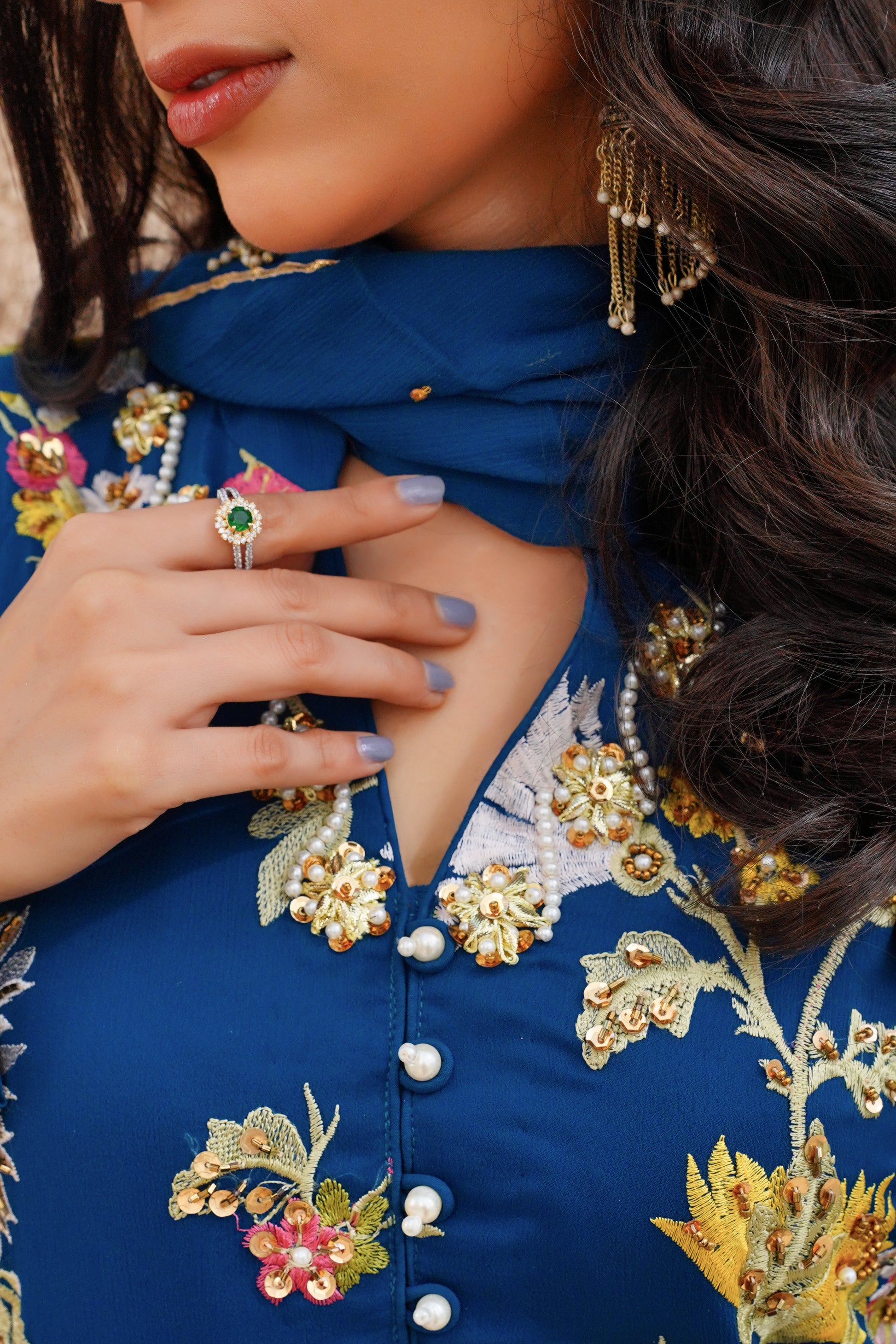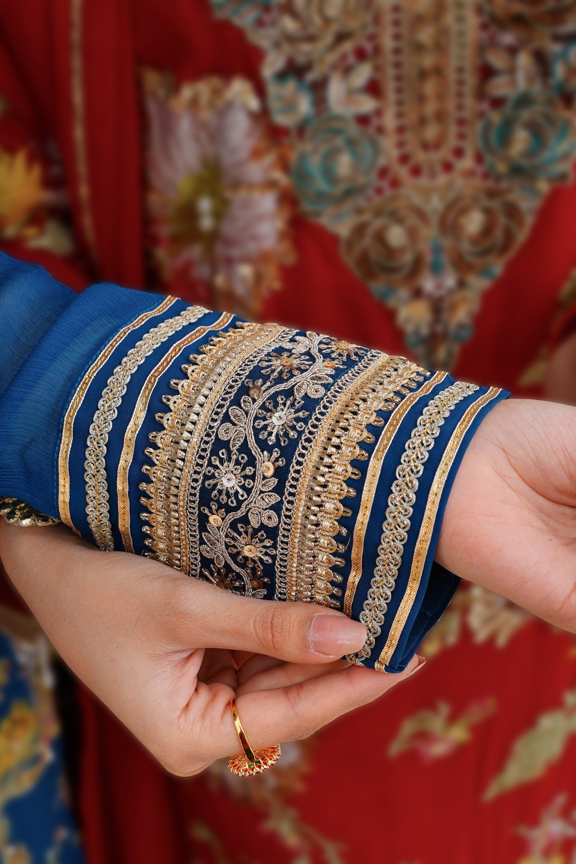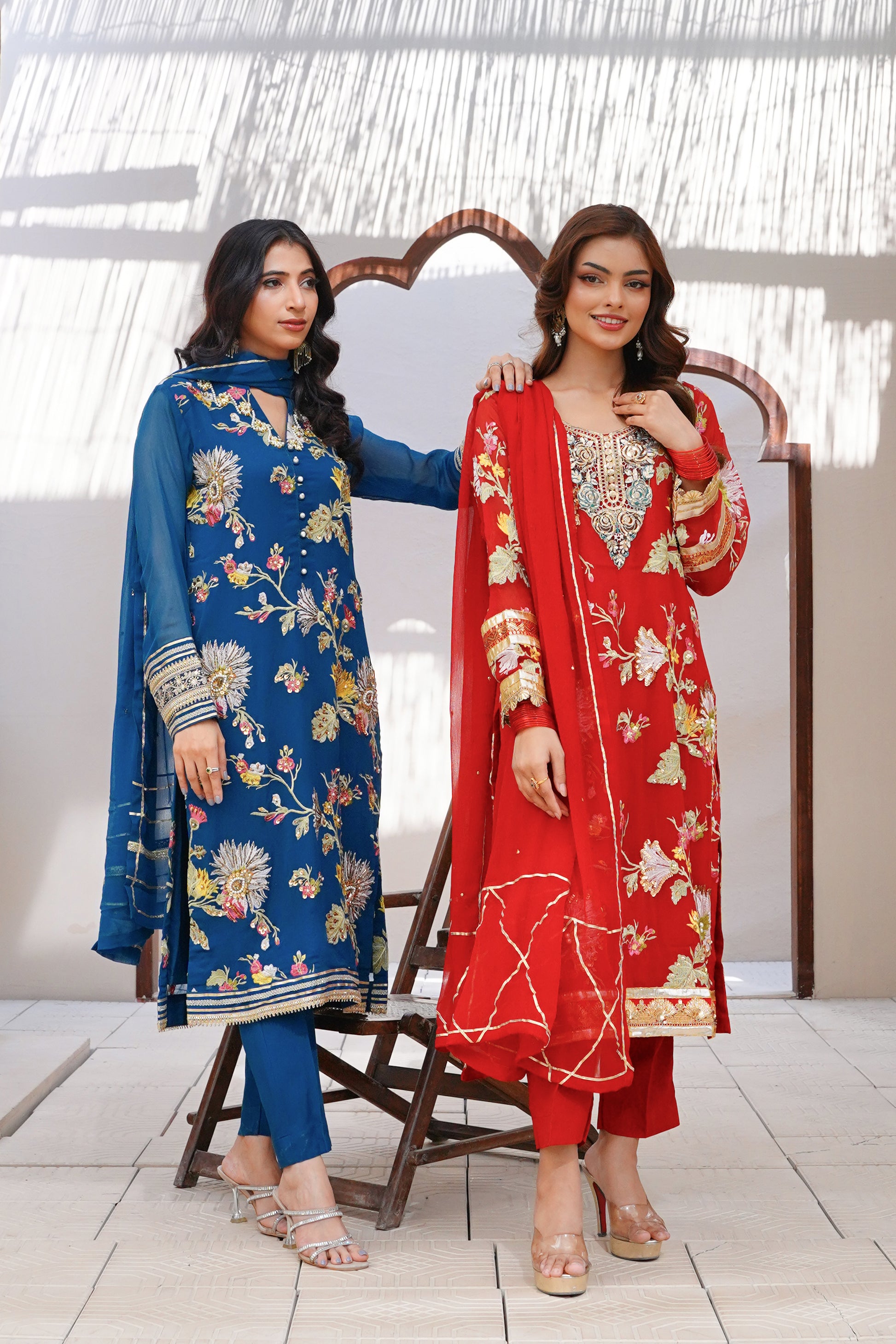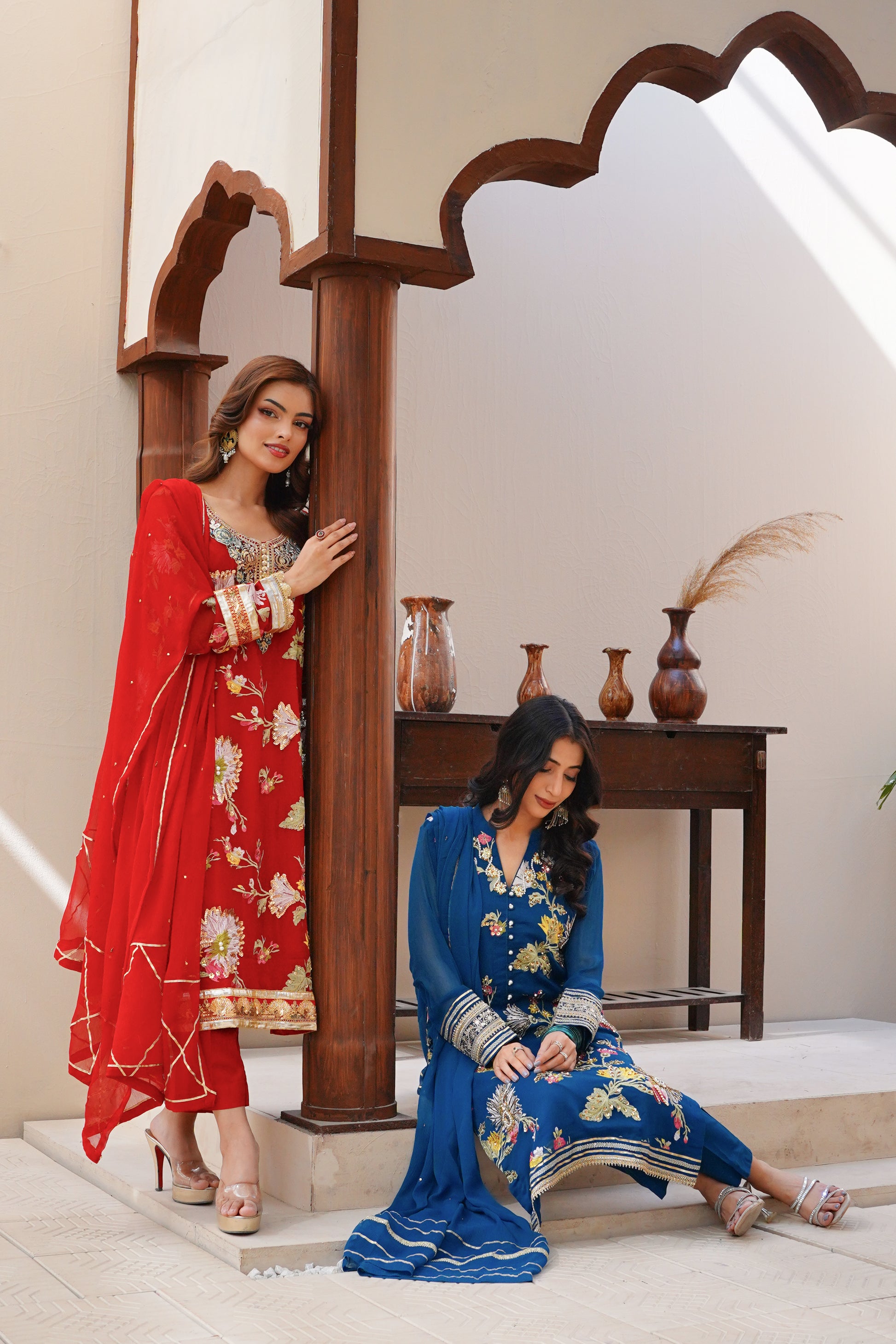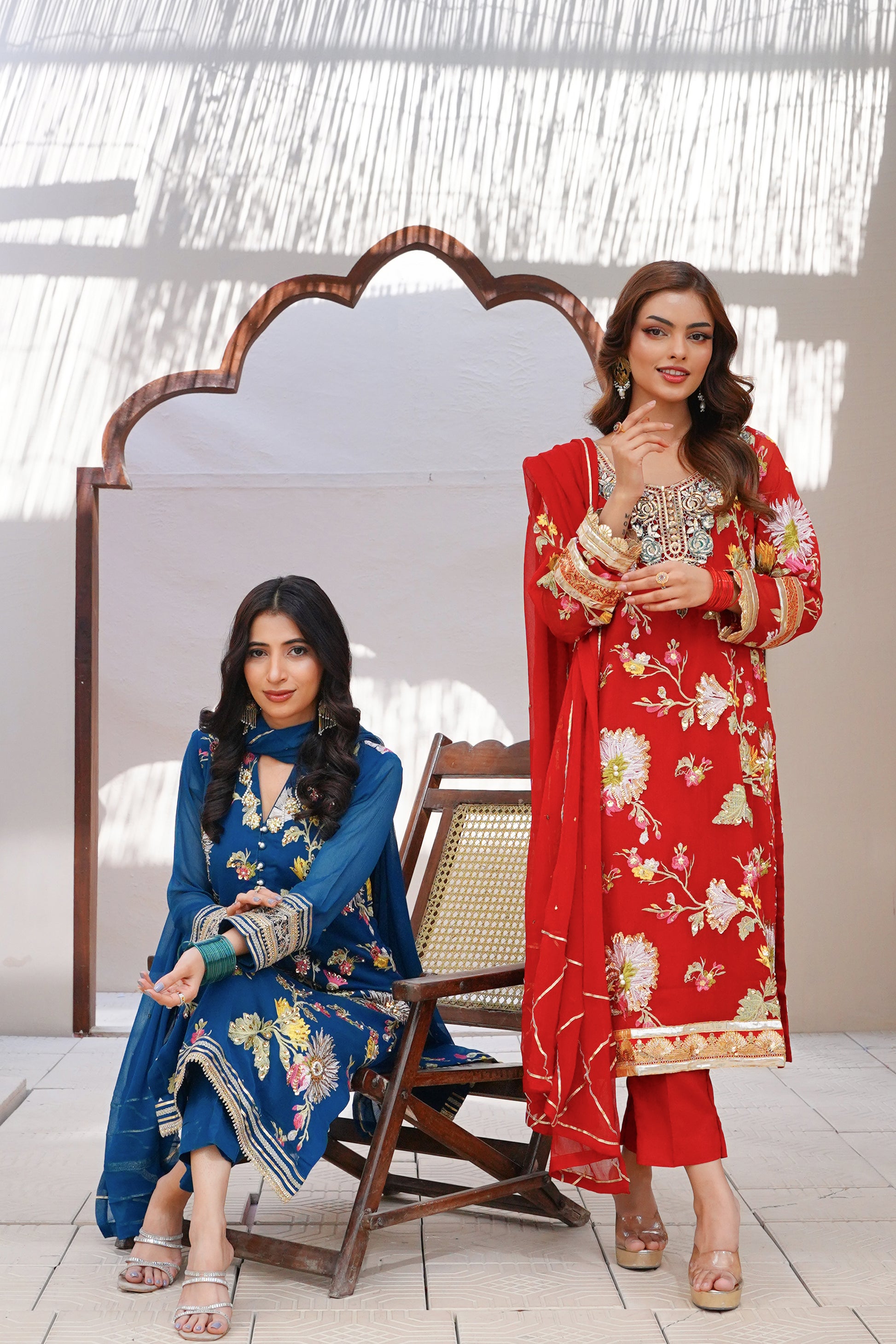 Bask in the glory of this luxe design in rich emerald green & red hues. The shirt showcases exquisite embroidery with handworked details on the neckline, and a lace overlay. The back is beautifully embroidered, adding a refined touch. The ensemble is completed with straight pants and a chiffon dupatta featuring chan, lace, and gota detailing.
