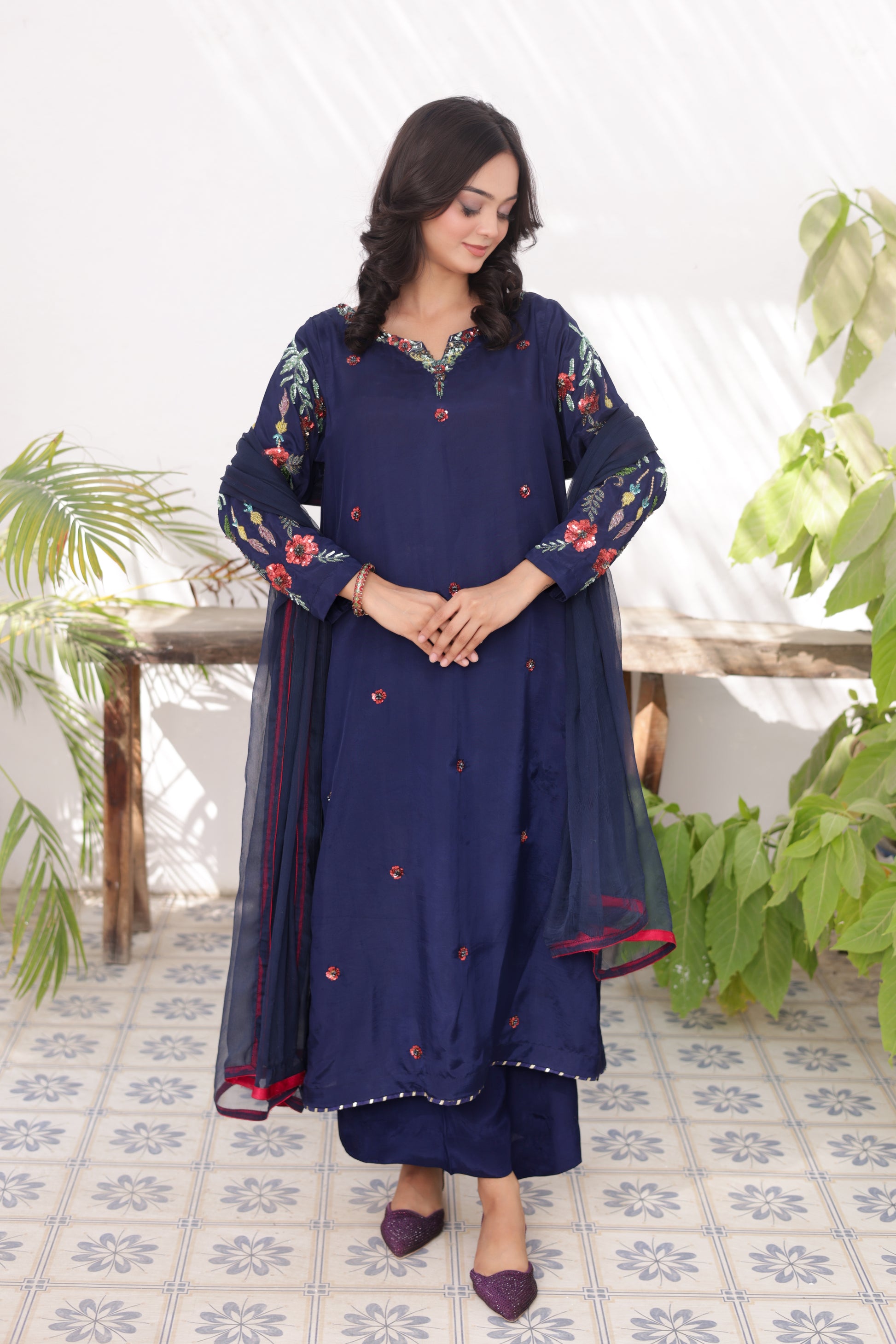 A navy blue outfit crafted from korean silk, blending classic elegance with intricate craftsmanship for a striking and refined look. The sraight shirt features floral sequinned handwork sleevs , adding a touch of opulence. Handworked neckline and chan on front. Paired with flared trousers in matching korean silk.