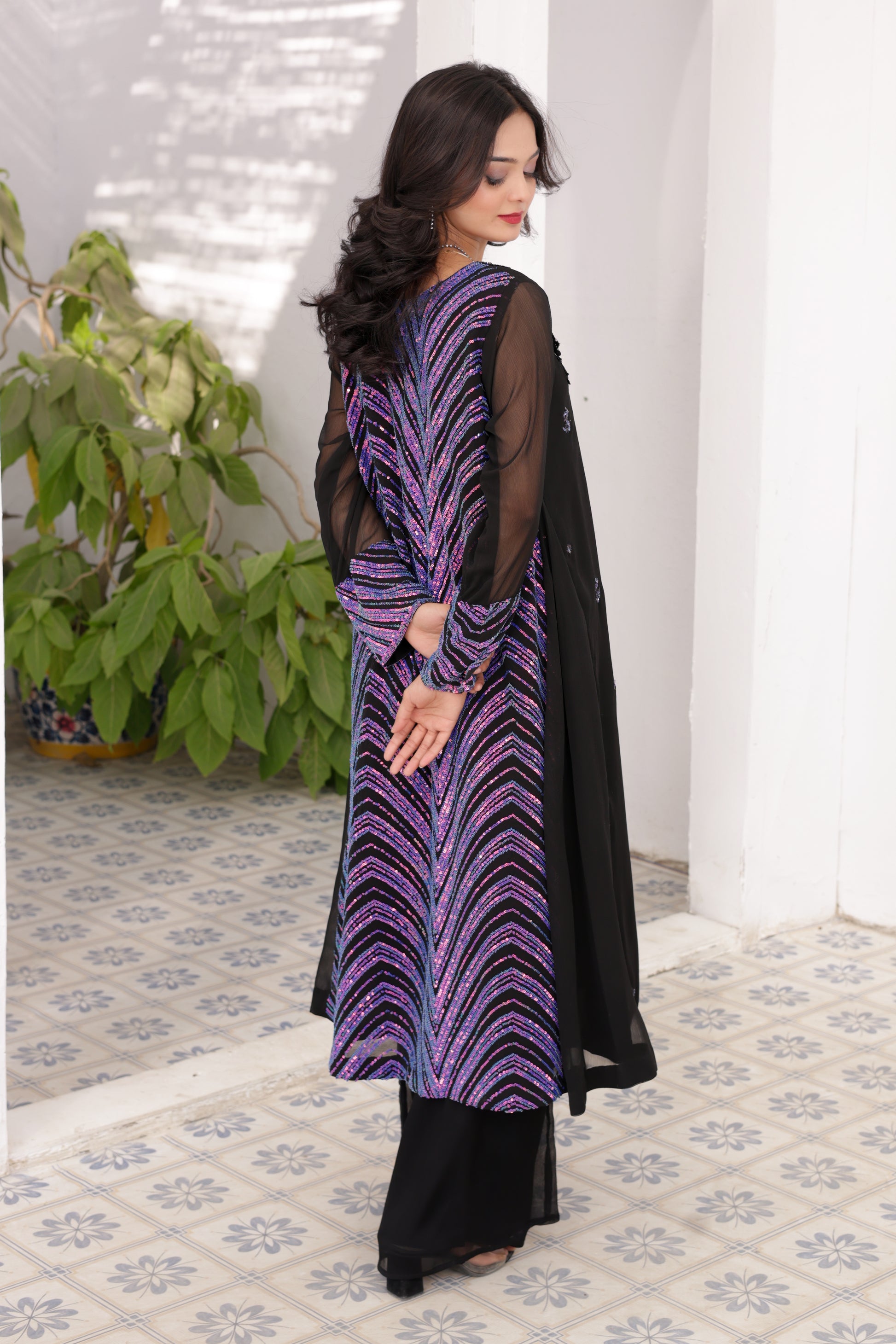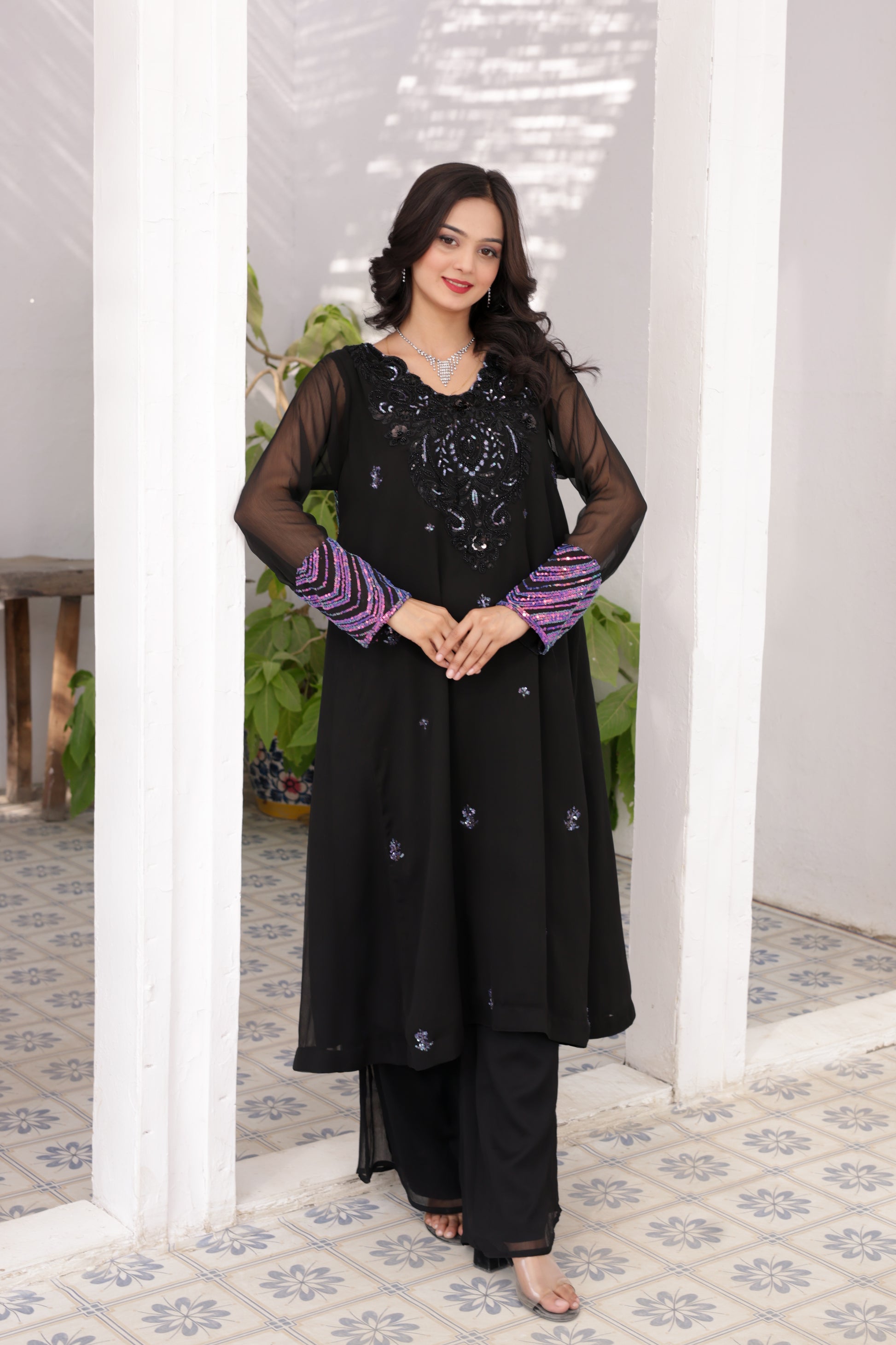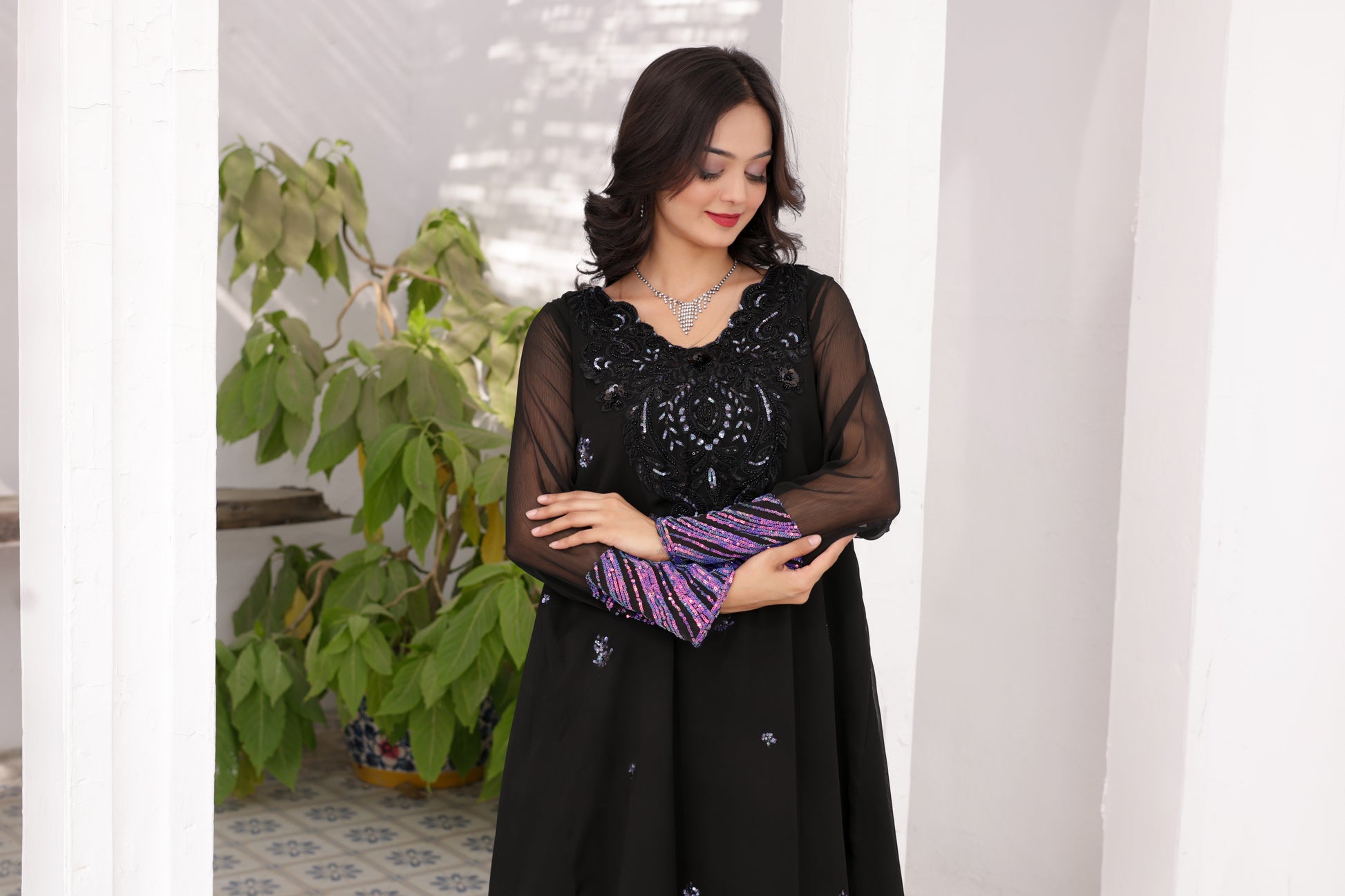 This black outfit crafted from chiffon features intricate embroidery on neckline in multi shades and black and seuinned back, trousers are styled with loose- fit in matching chiffon offering comfort and balance to the richly embroidered shirt.