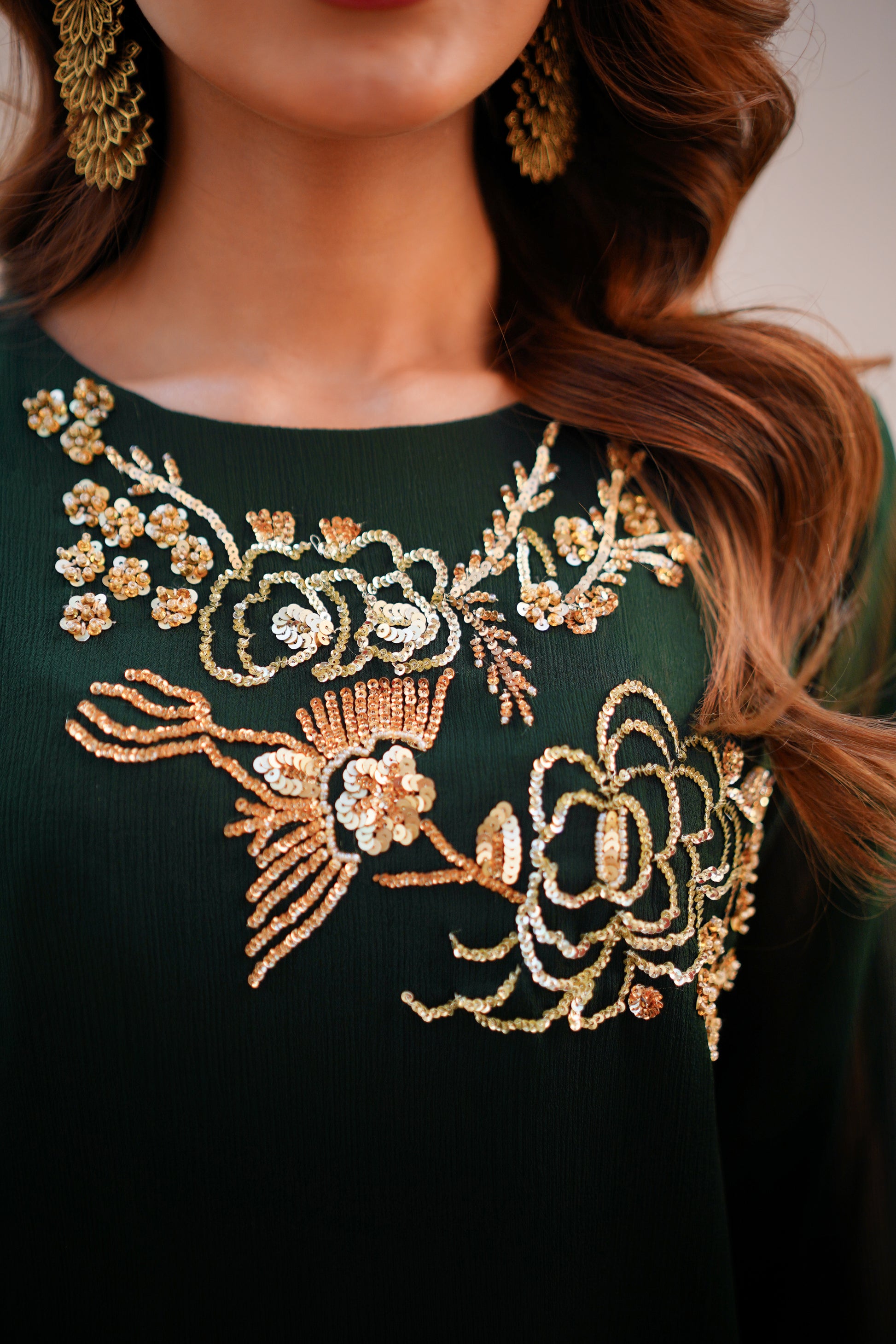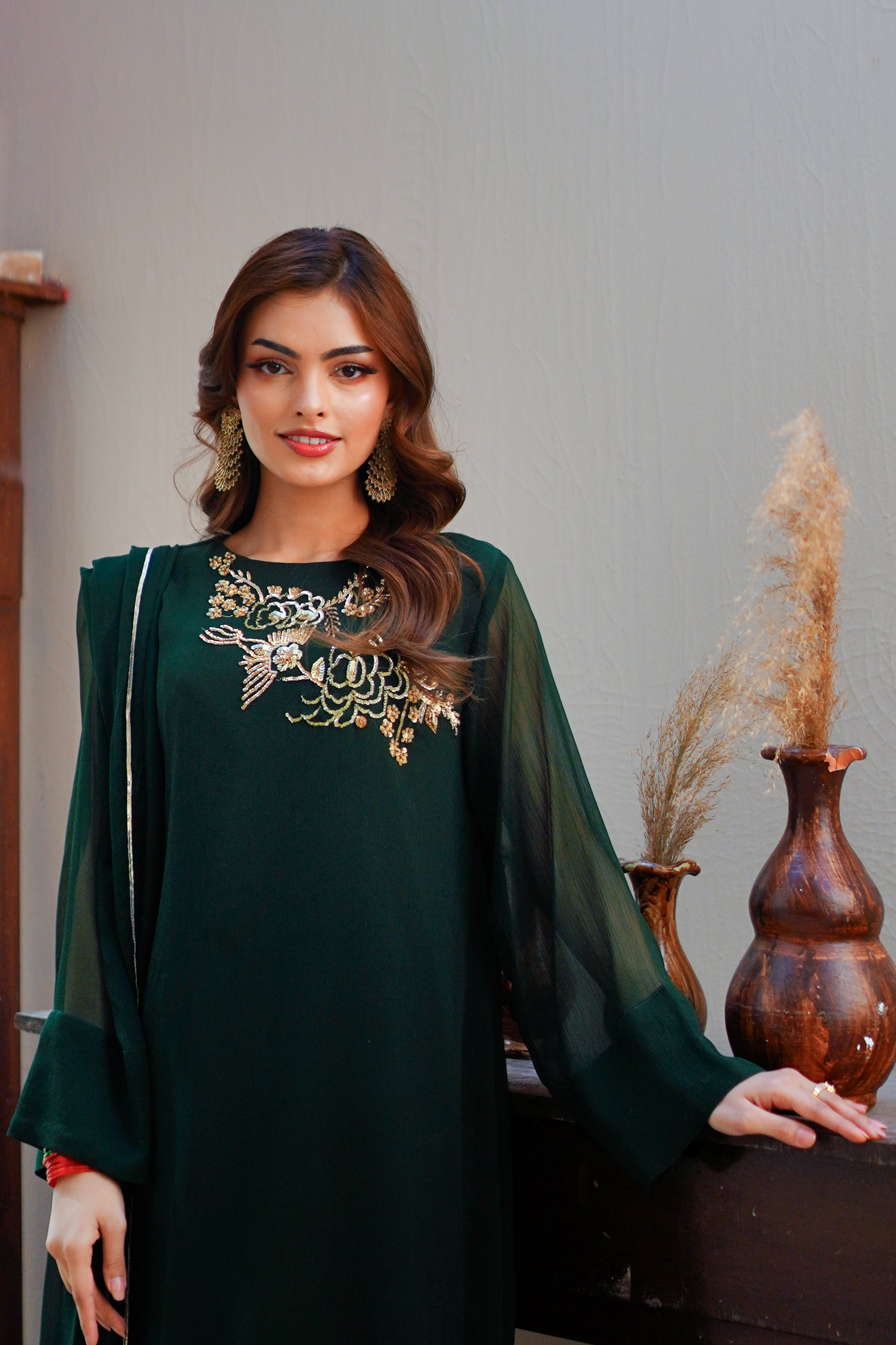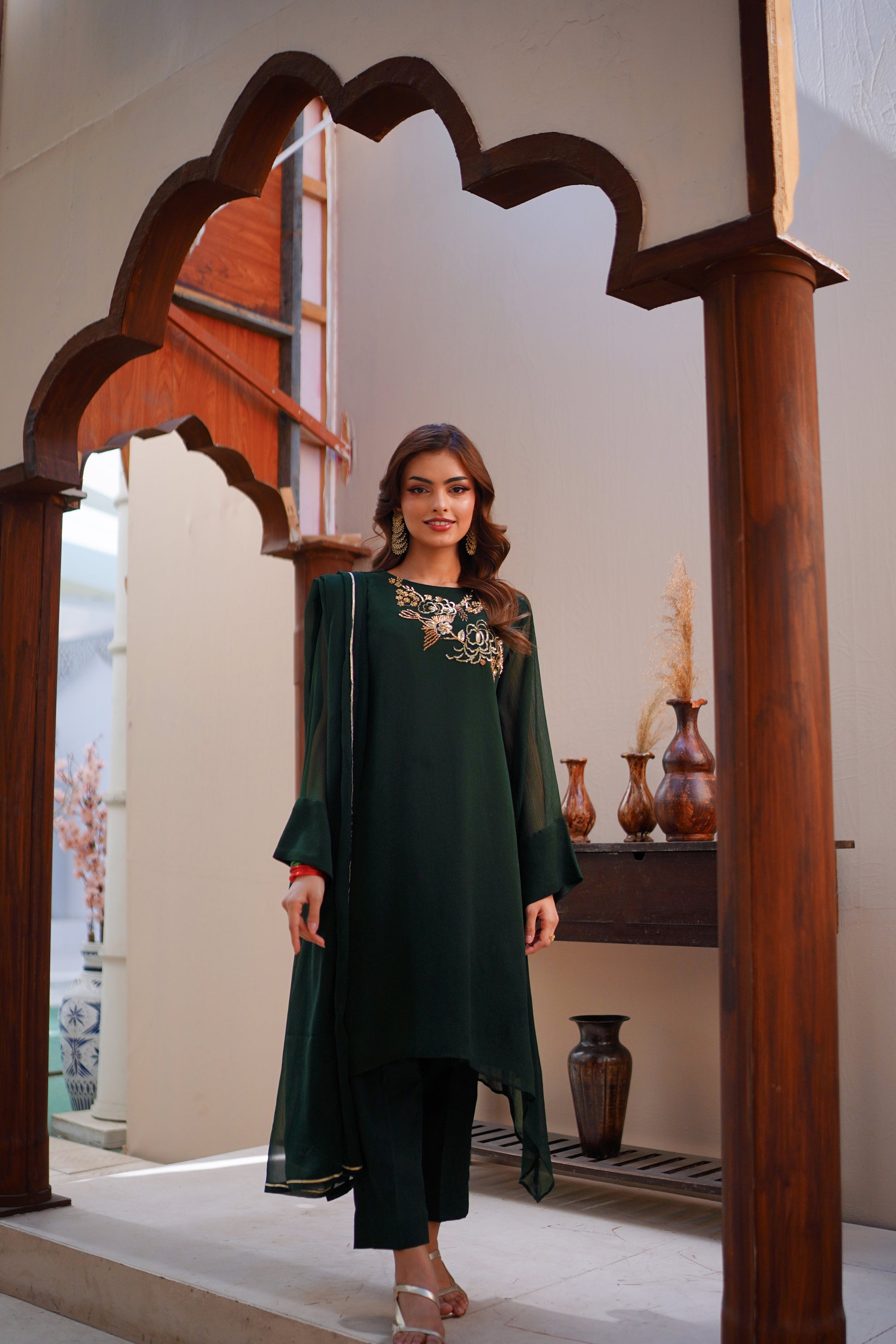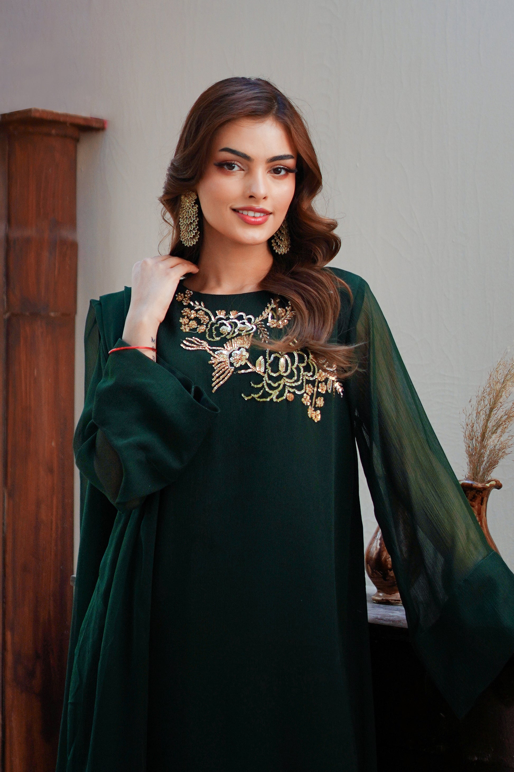This hand-embroidered suit features a beautiful emerald green and maroon color options that exude elegance and sophistication. The side drop shirt adds a unique touch to this classic suit which is a mod twist to a traditional design with its smart details.