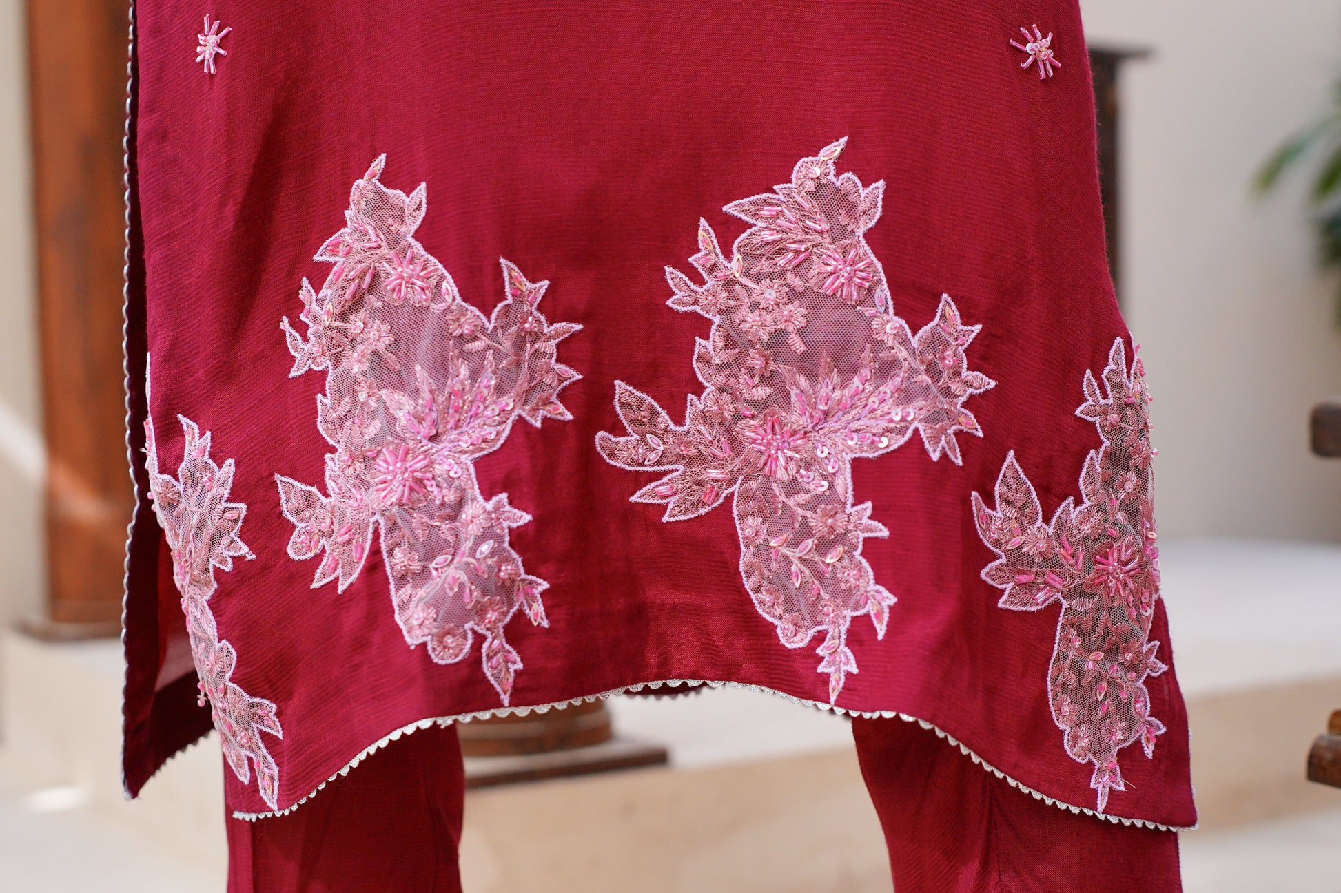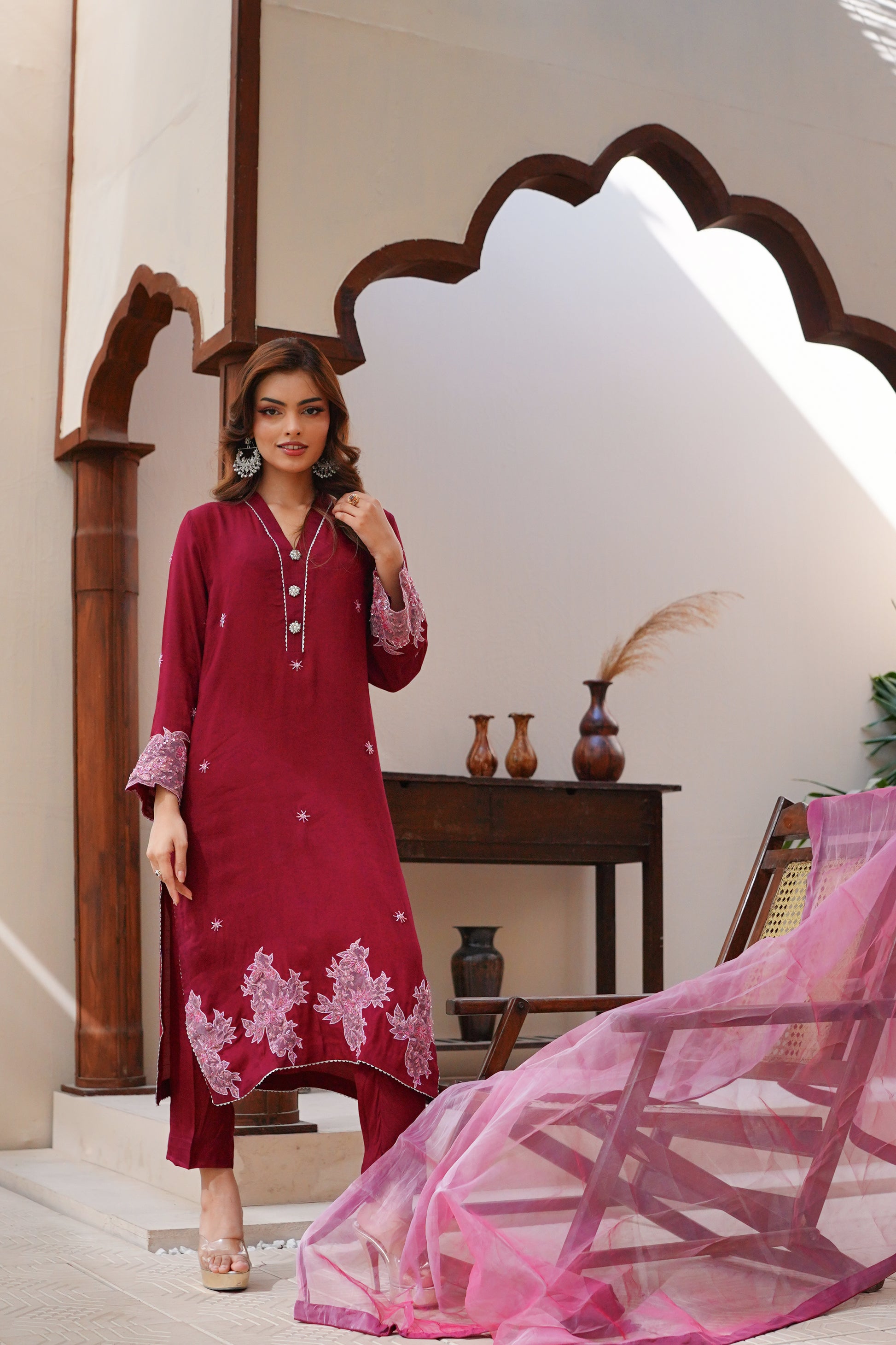 This magenta hand-embroidered appliqued outfit will make you stand apart from the crowd. Paired with straight pants and a piping-finished organza dupatta just makes it perfect for any evening.