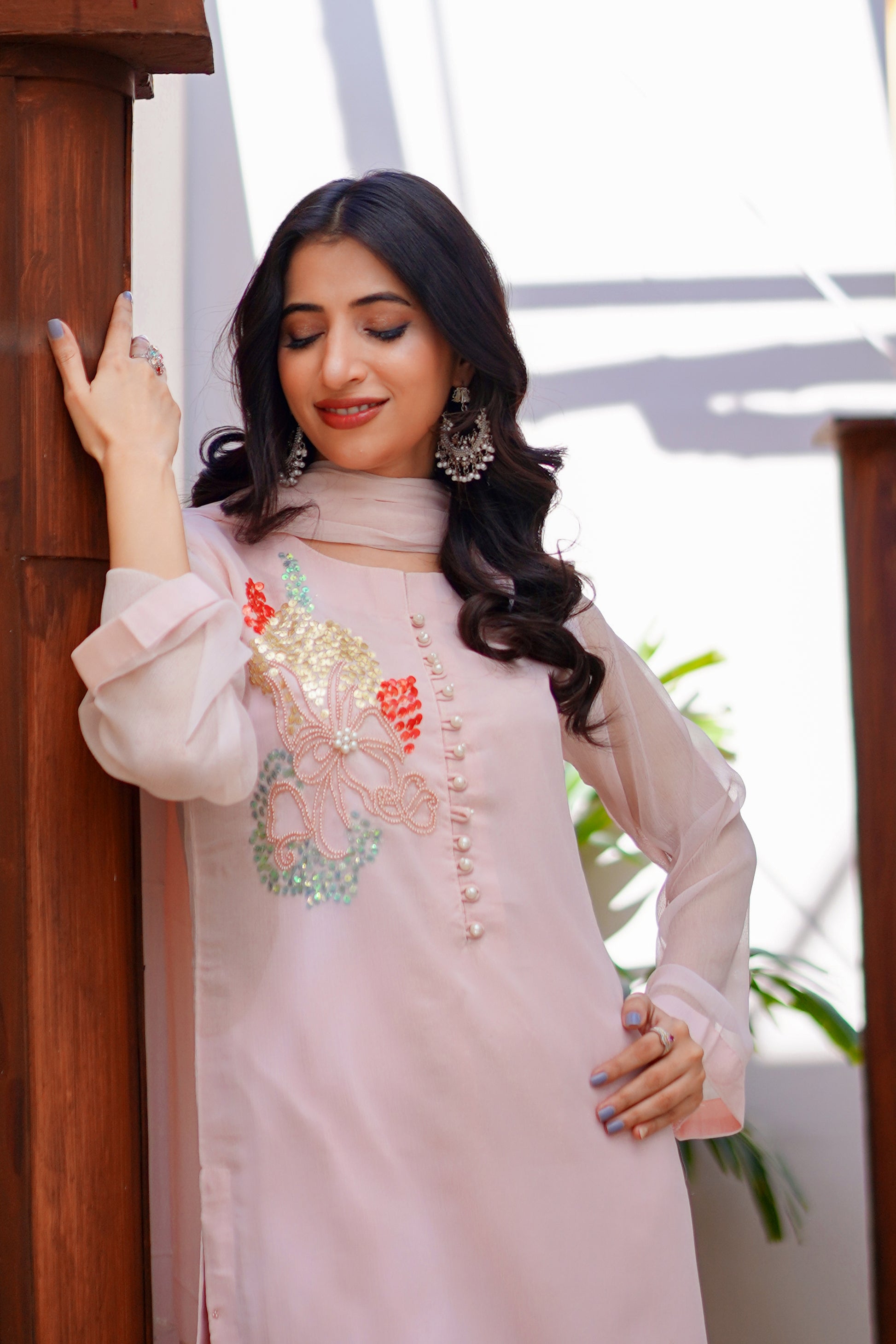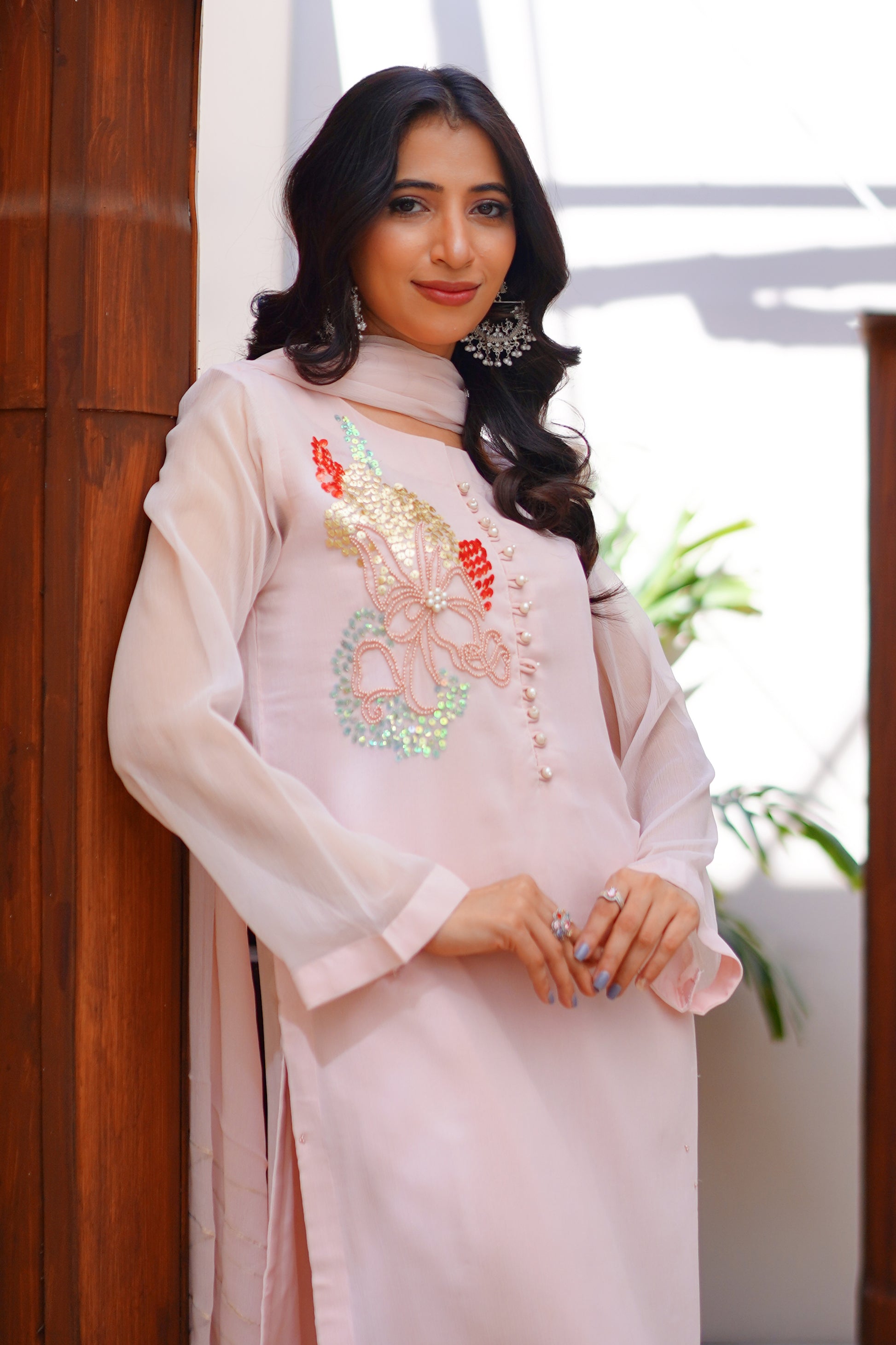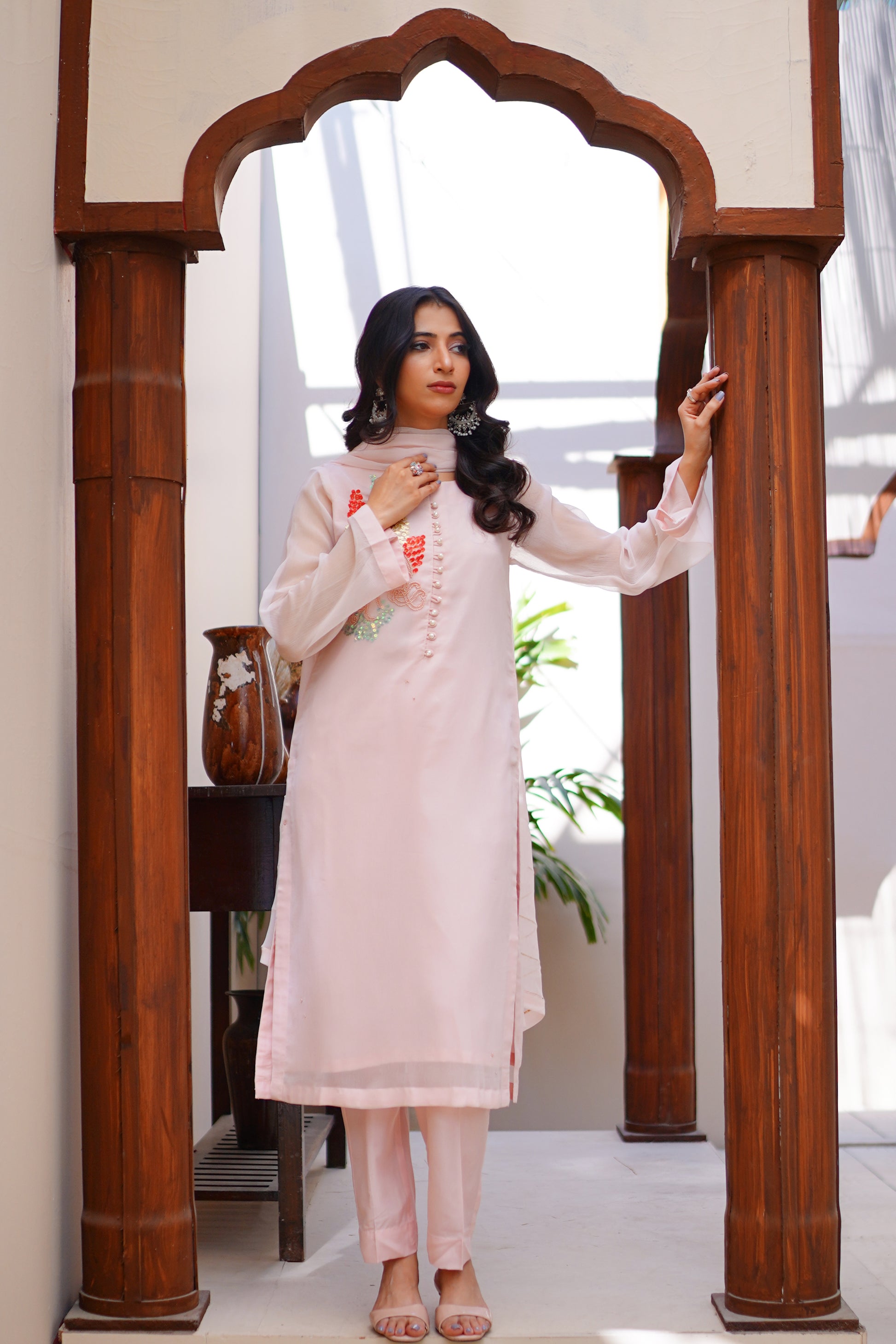 This 03 PC Chiffon hand-embroidered suit features a beautiful powder pink color with contrasting embroidery. Made from high-quality chiffon, this suit is both elegant and comfortable. Perfect for any formal occasion, this suit is sure to make a statement.