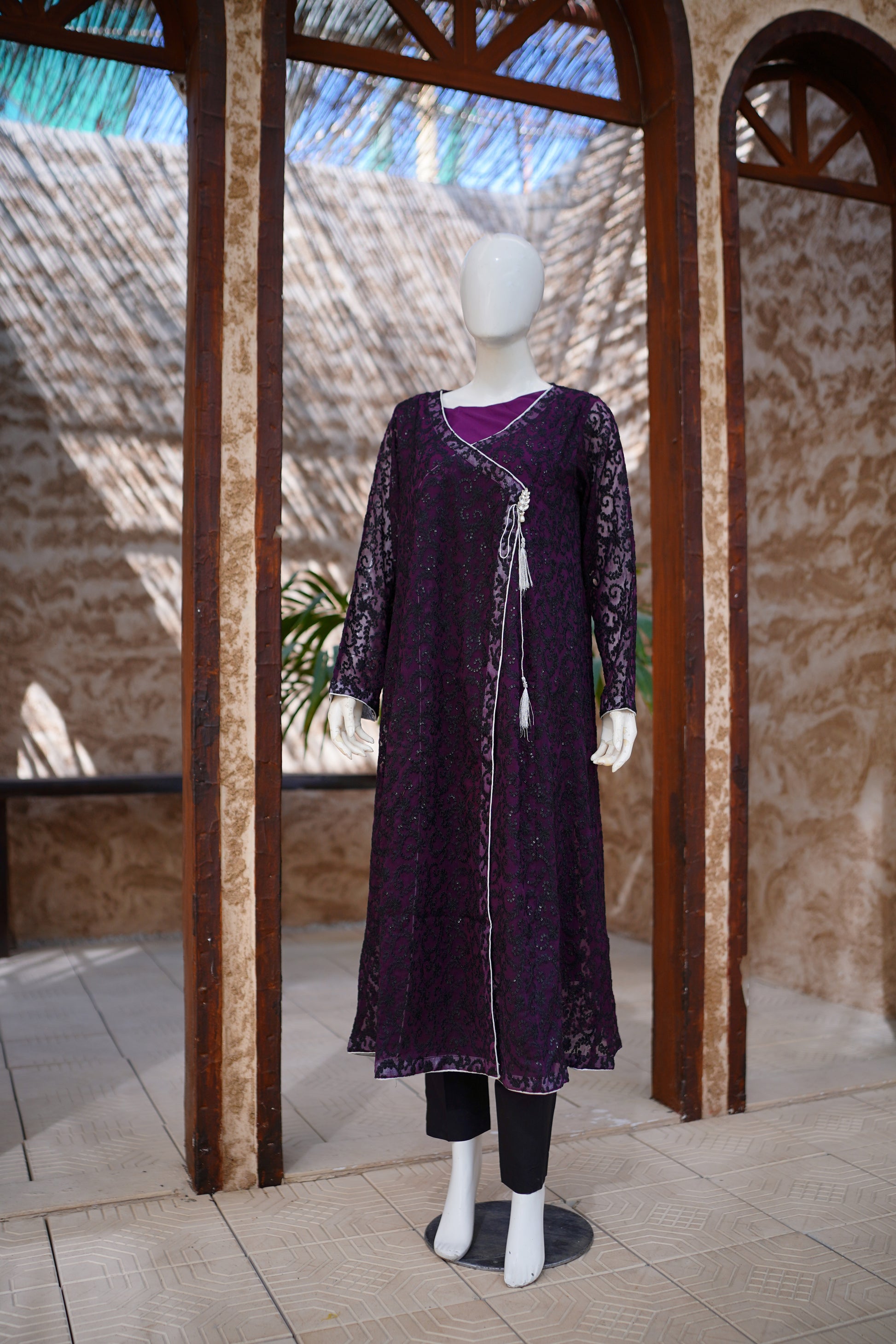 Draped in regal purple, this angrakha is adorned with self embroidered shirt completed with silver dori and jamawar finishing. The dress is complemented by a gracefully flowing hem and matching pants.