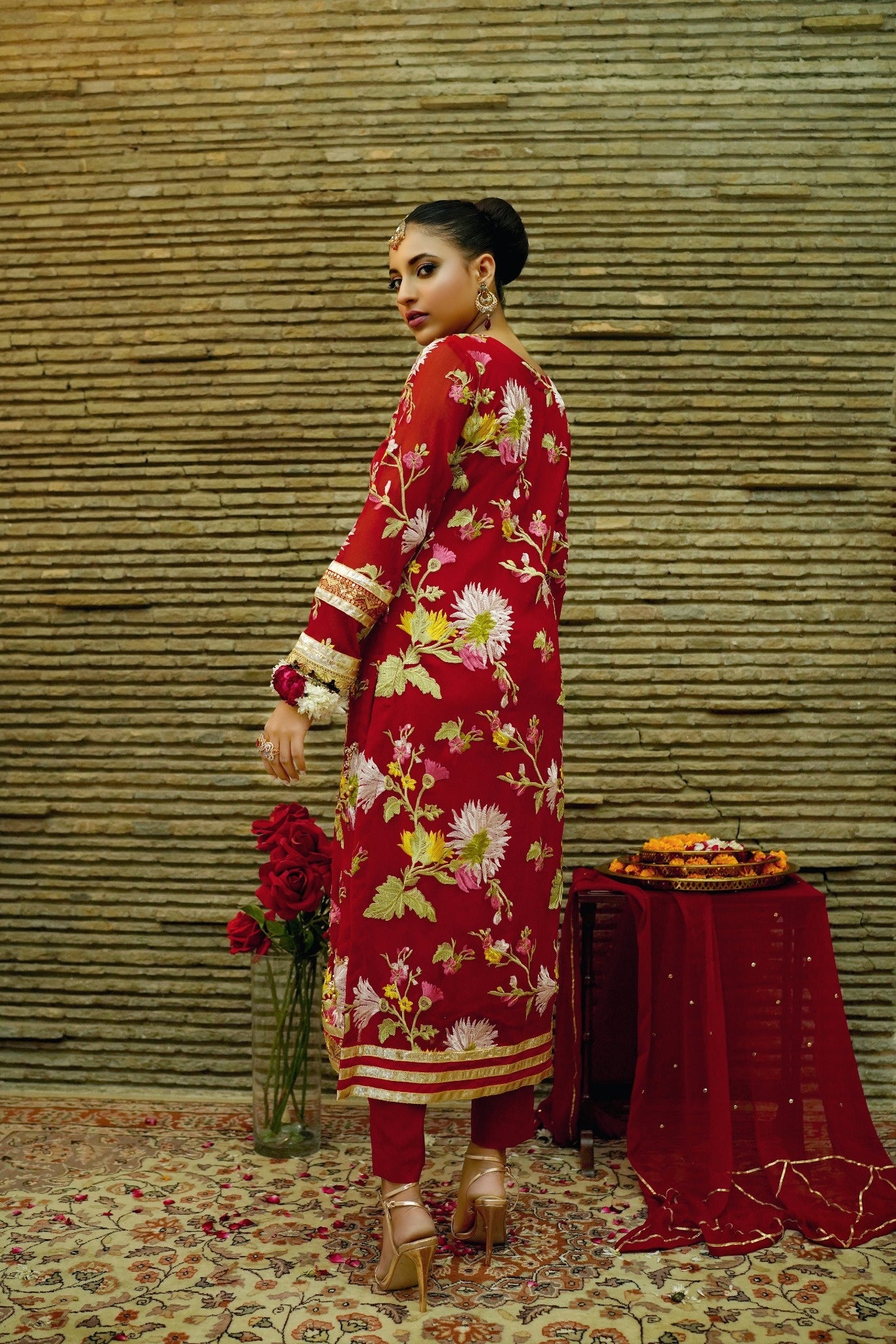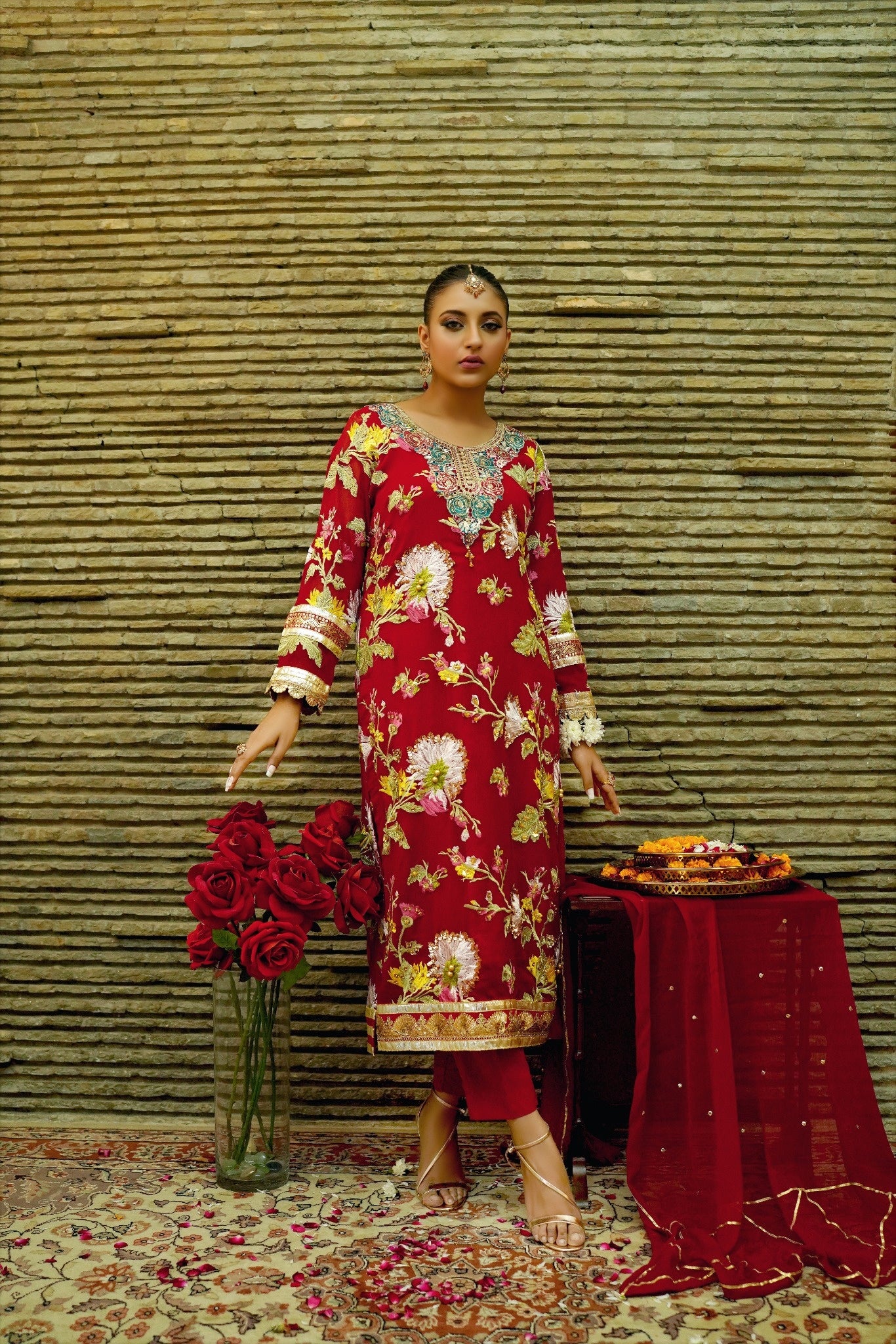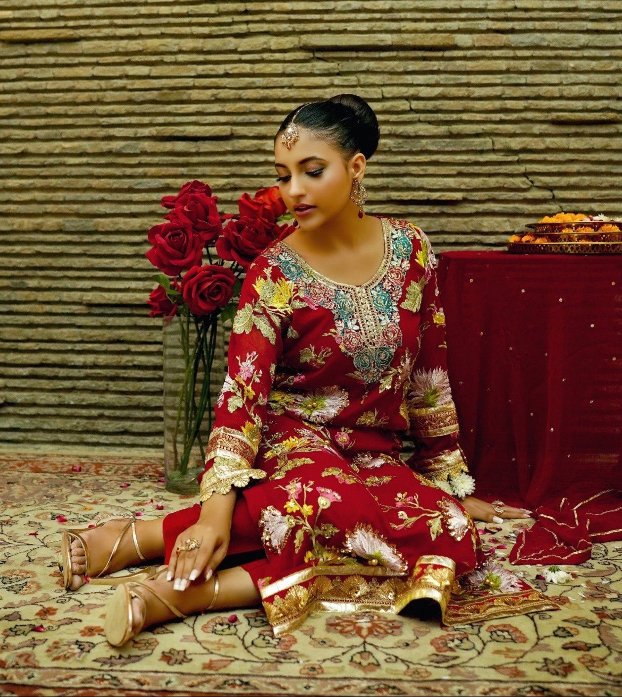 Here’s a beautifully embellished formal top with flawless finishing touches! The gold embellishments against the maroon embroidered fabric create a stunning combination, further enhanced by the contrast of gota and lace details. The neckline features contrasting colors, making this top a perfect 10/10 for formal wear. Paired with straight pants, a chiffon dupatta with chun, lace, and gota detailing. Complete your look with nude lip color and light-toned heels for an effortlessly elegant vibe.