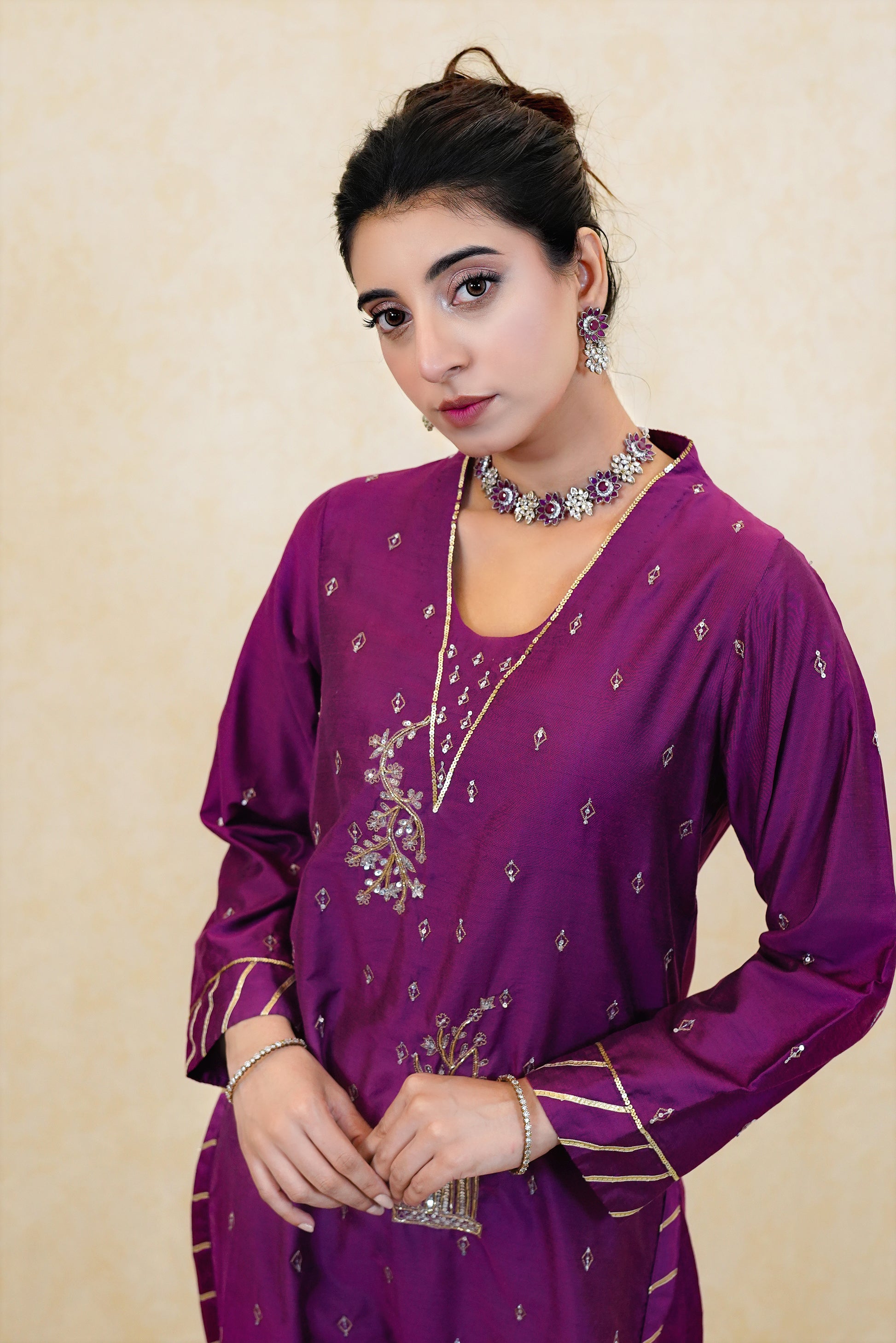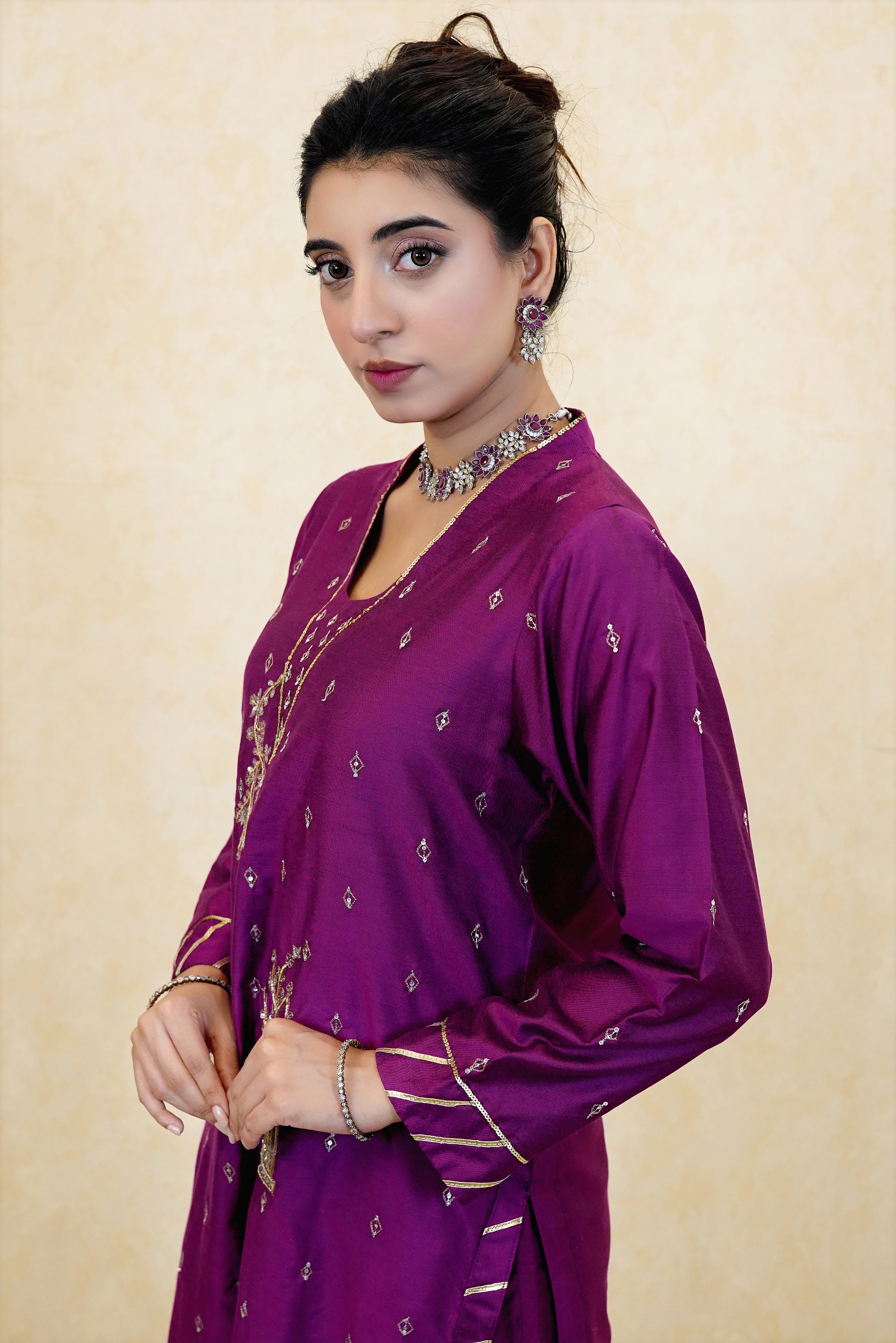 Heres a great embellished formal top with the perfect finishing touches! The gold embellishment against the magenta purple fabric looks perfect combined with gota on sides and sleeves.