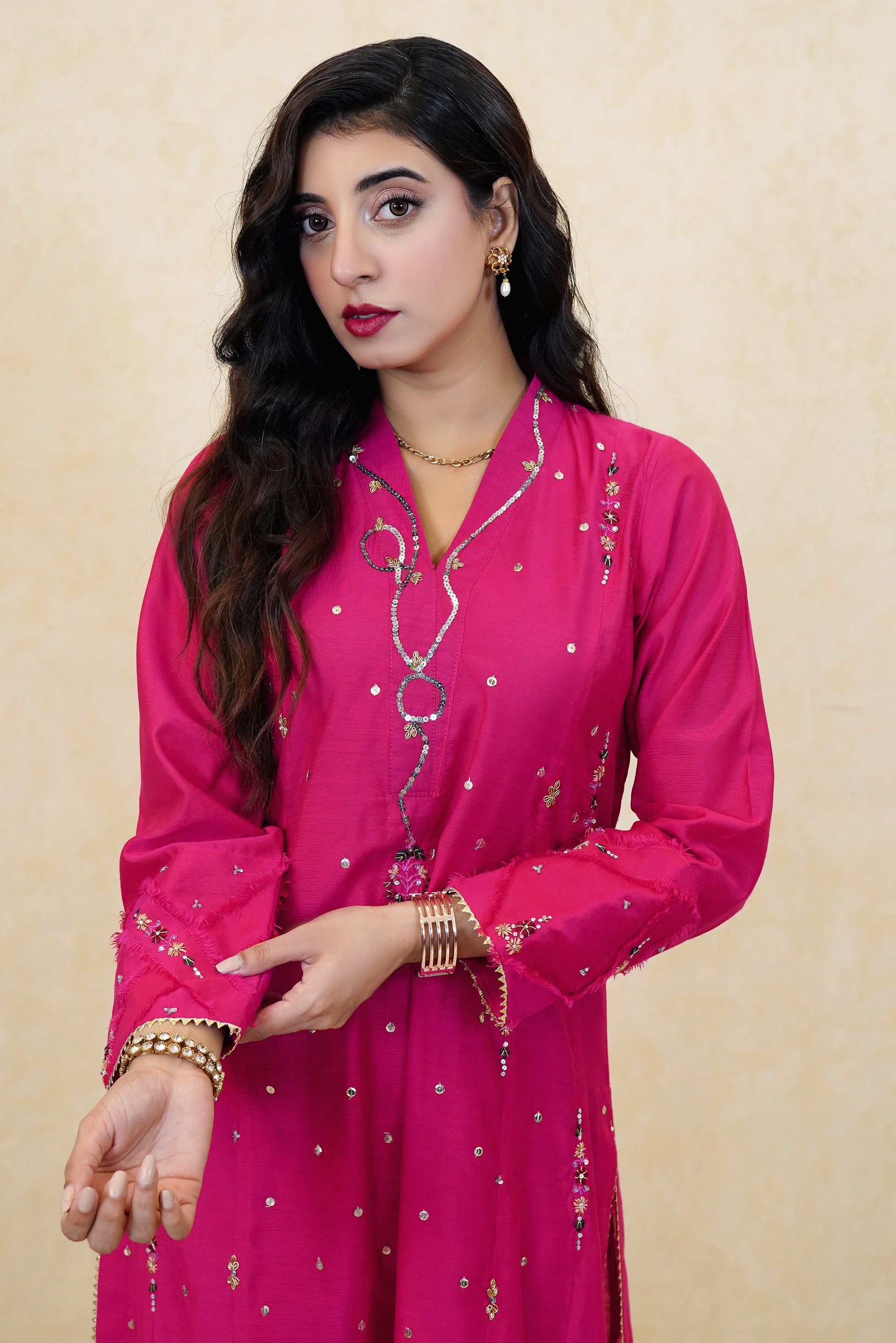 This bright pink formal top is detailed with gorgeous handwork making it perfect for any special occasion, patterns detailed with dabka and coloured thread work is a unique and exquisite.