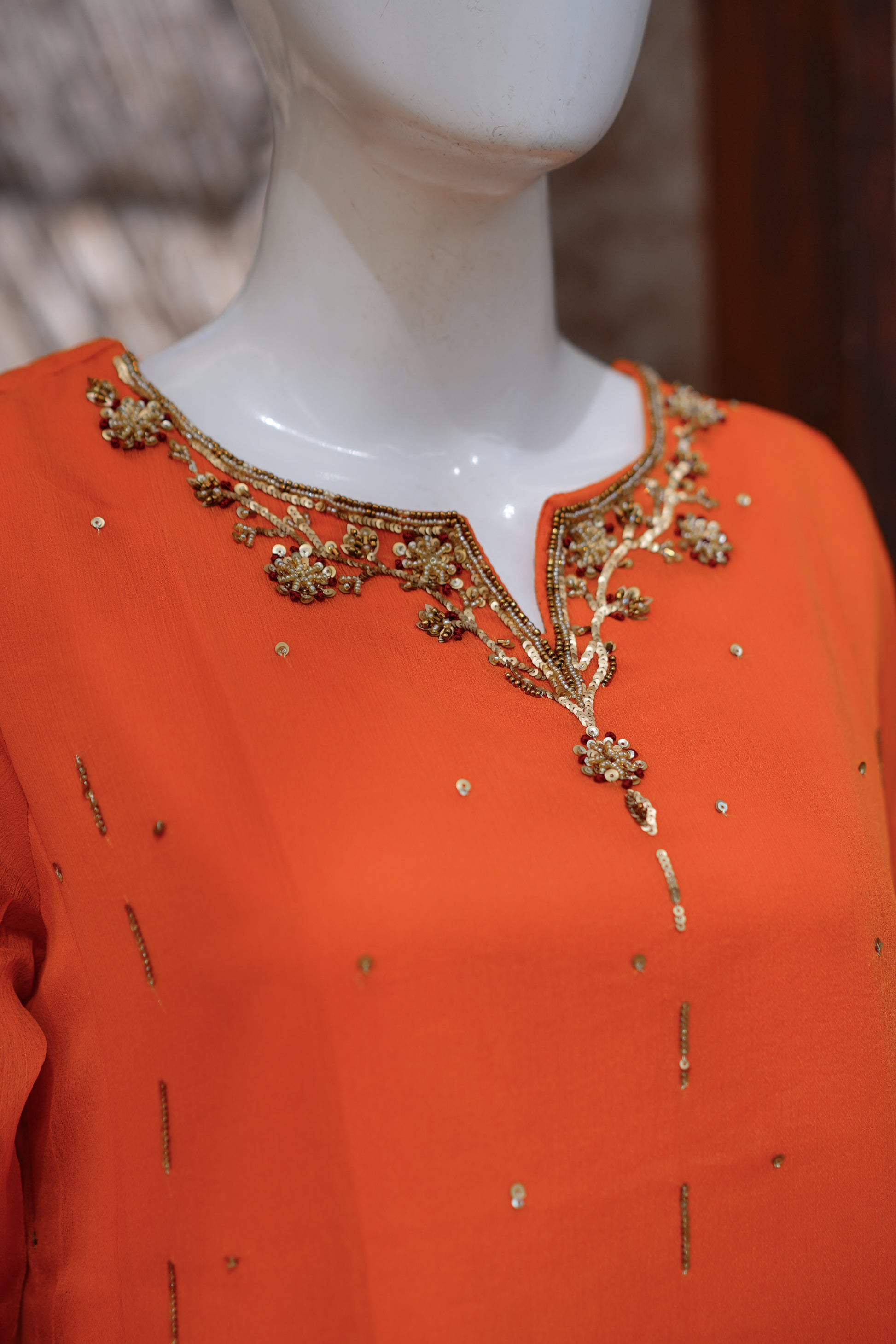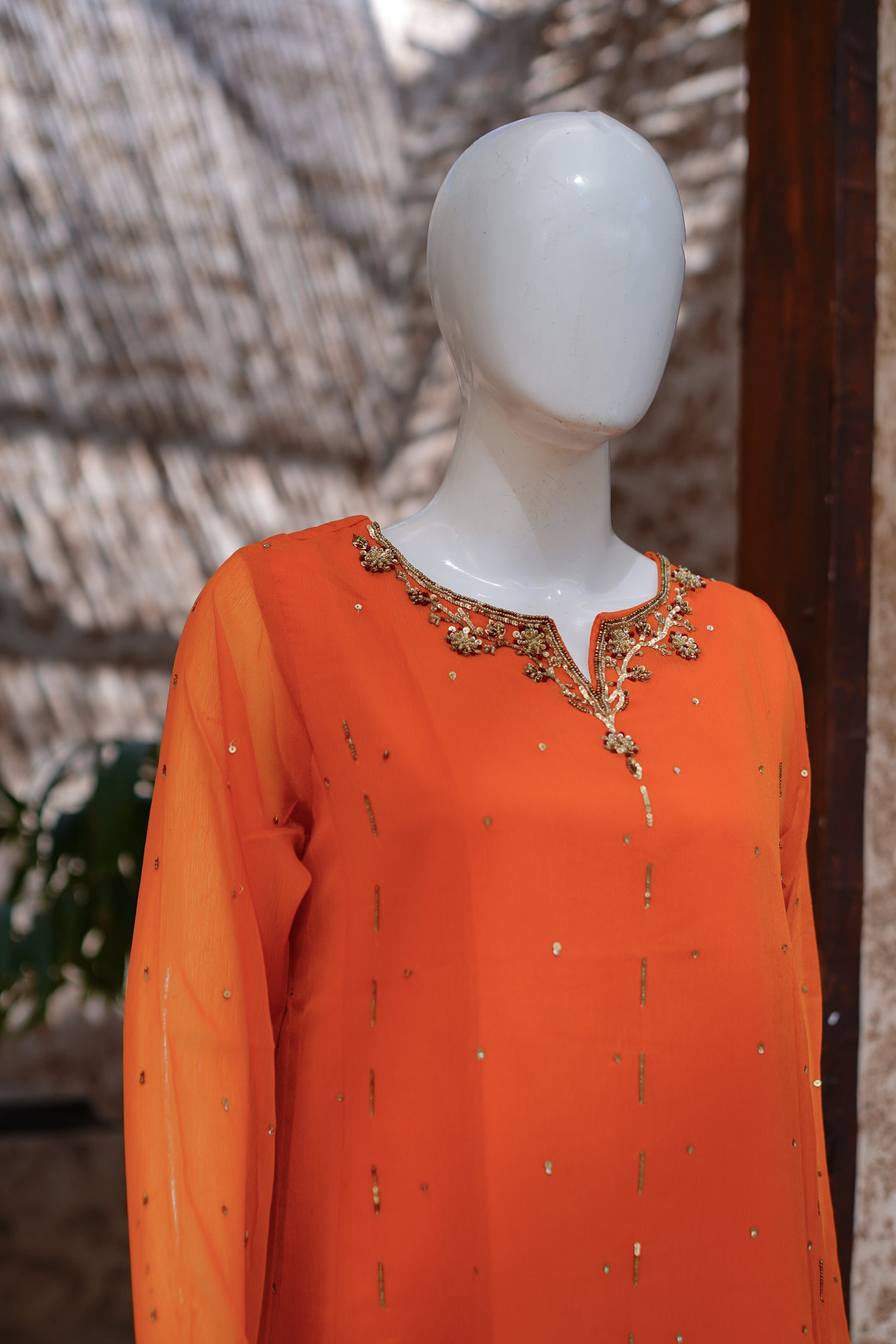 Bursting with the warmth of a summer sunset, this orange ensemble celebrates playful sophistication. Delicate detailing of sitara all over the shirt adds texture & character. Bold yet refined, it's a celebration ready look.